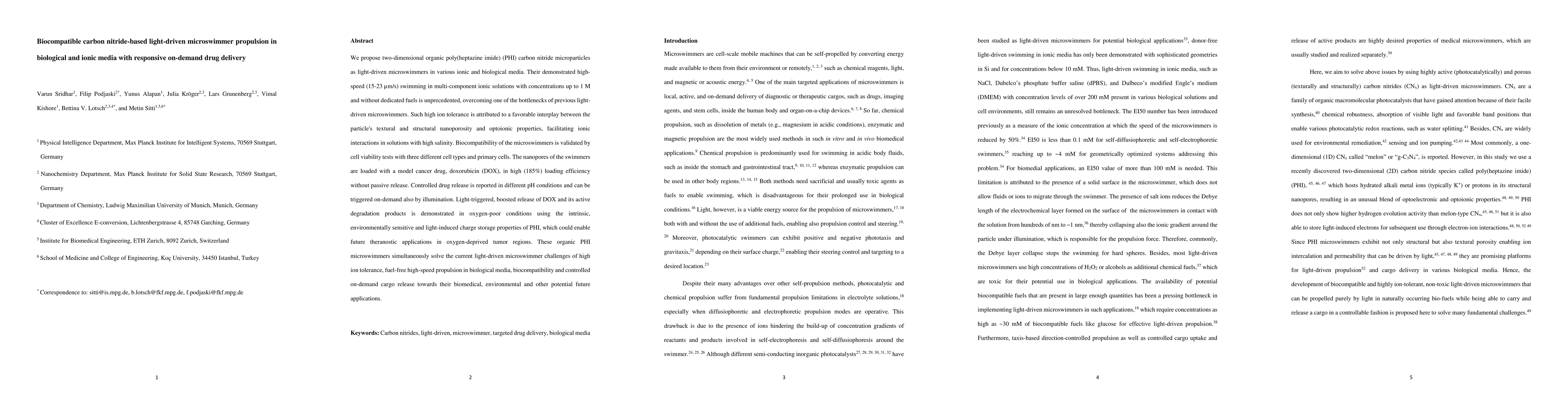 This paper introduces two-dimensional organic poly(heptazine imide) carbon nitride microparticles as light-driven microswimmers capable of high-speed propulsion in ionic and biological media without external fuels. These microswimmers exhibit biocompatibility and can load and release a cancer drug on-demand, triggered by pH changes or light, potentially enabling theranostic applications in low-oxygen tumor environments.