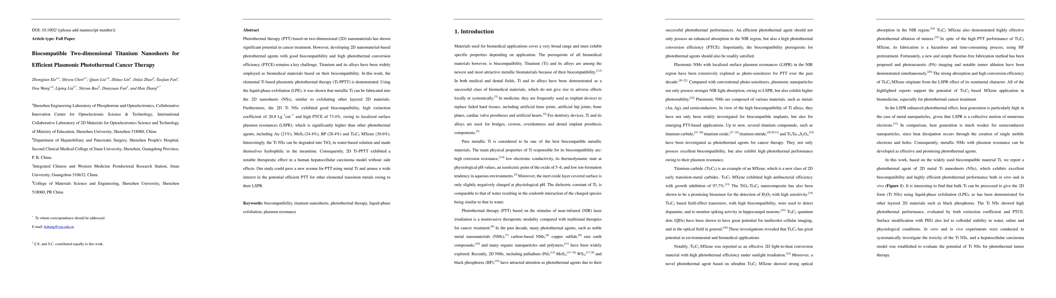 This research develops biocompatible two-dimensional titanium nanosheets for efficient plasmonic photothermal cancer therapy, demonstrating high photothermal conversion efficiency and promising therapeutic effects in cancer treatment with minimal side effects. The titanium nanosheets exhibit superior performance compared to other materials, highlighting their potential for various biomedical and environmental applications.