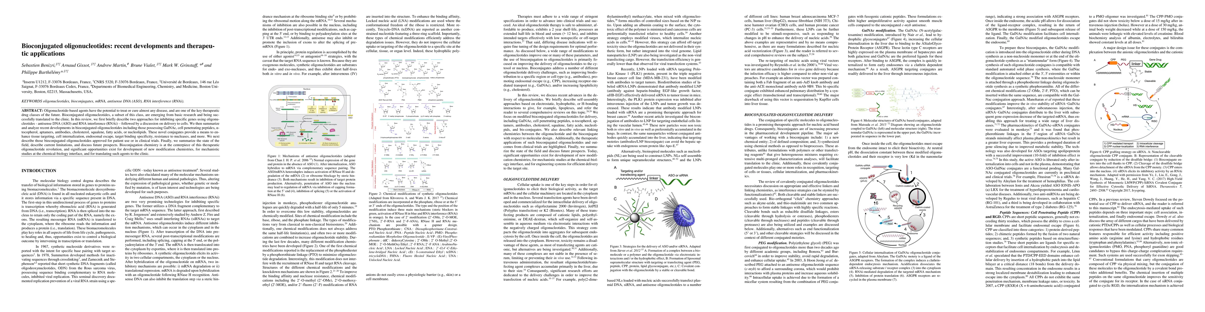 This paper reviews recent advancements in bioconjugated oligonucleotides, focusing on their therapeutic potential and clinical applications. It discusses various conjugation strategies to enhance delivery and efficacy, and highlights approved and trial-stage bioconjugated oligonucleotides, while also addressing current limitations and future research directions.