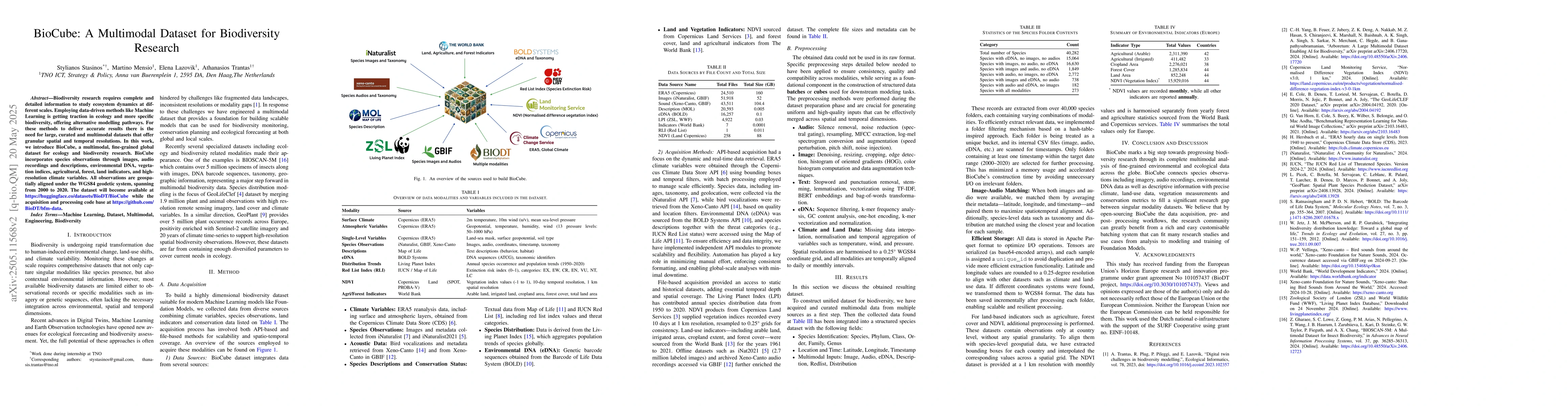 The paper introduces BioCube, a multimodal dataset for biodiversity research, incorporating species observations through images, audio recordings, descriptions, environmental DNA, vegetation indices, agricultural and forest indicators, land indicators, and high-resolution climate variables. All data is geospatially aligned under WGS84 from 2000 to 2020.