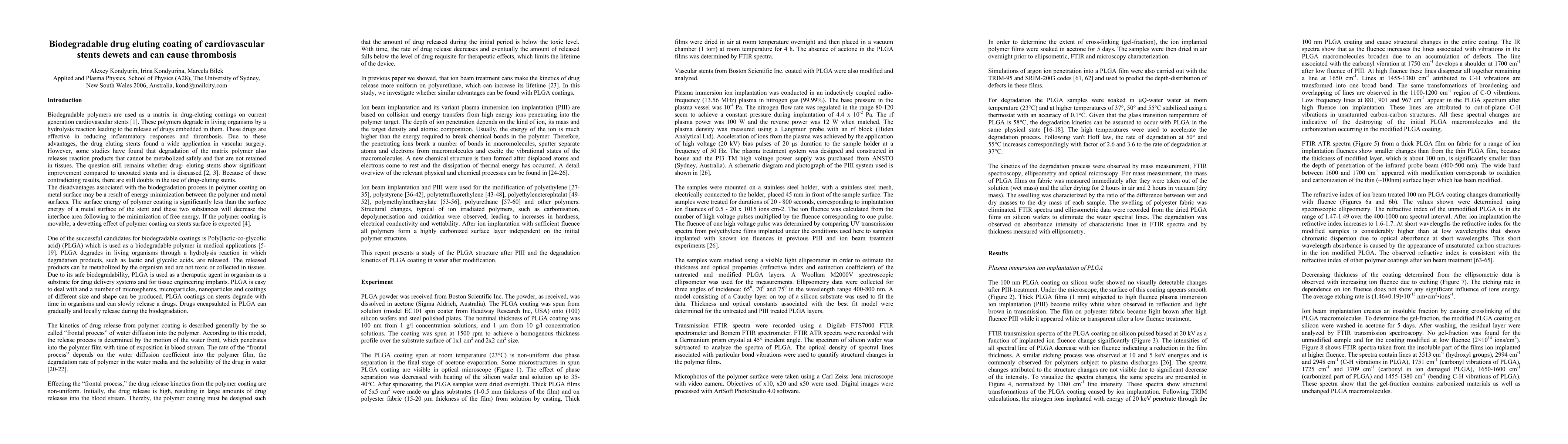 The results of our investigation of ion implantation of PLGA show that the PLGA films undergo crosslinking, carbonization and etching. The PLGA coating degrades in water by a hydrolysis reaction. The dewetting of PLGA coating under water is observed on silicon wafer, metal and carbon surfaces. As the result, the coating is ruptured up to separate drops of PLGA on the surface. The dewetting process can be eliminated by an ion beam implantation treatment, when the ions penetrate through the whole PLGA coating. The dewetting process in the modified layer can be eliminated even with low fluence (10^14 ions/cm2) modification. The amount of degradable PLGA in the modified layer depends on the fluence of ion implantation and can equal up to 80% of the film at low fluence of 10^14 ions/cm2.