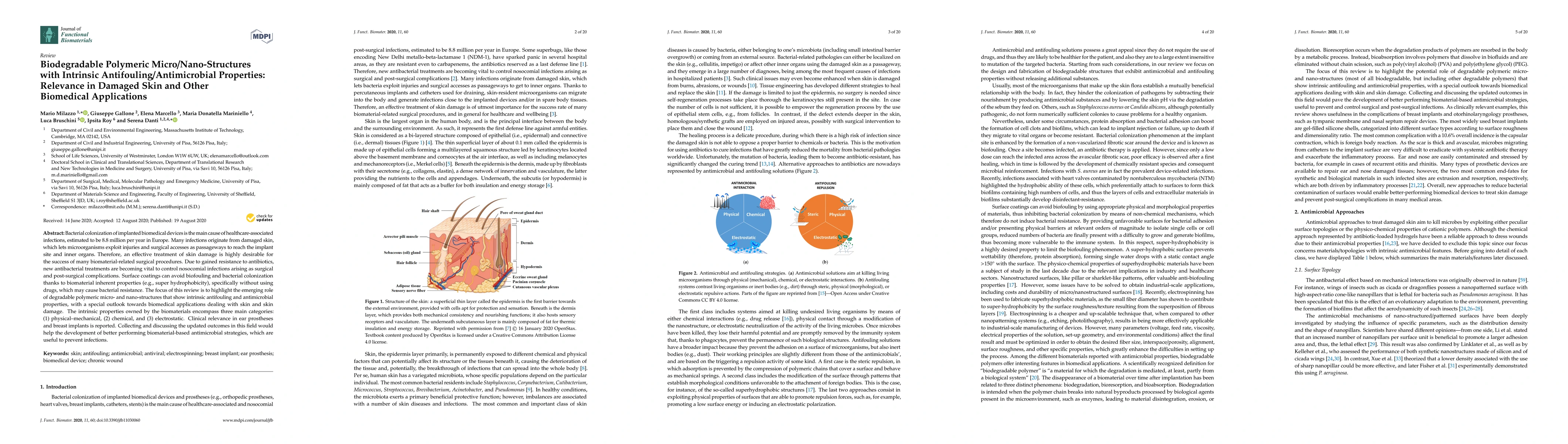 This paper reviews biodegradable polymeric micro/nano-structures with intrinsic antifouling and antimicrobial properties to combat bacterial colonization in biomedical devices, especially in damaged skin scenarios. The focus is on the physical-mechanical, chemical, and electrostatic properties of these materials to prevent infections without antibiotic resistance.