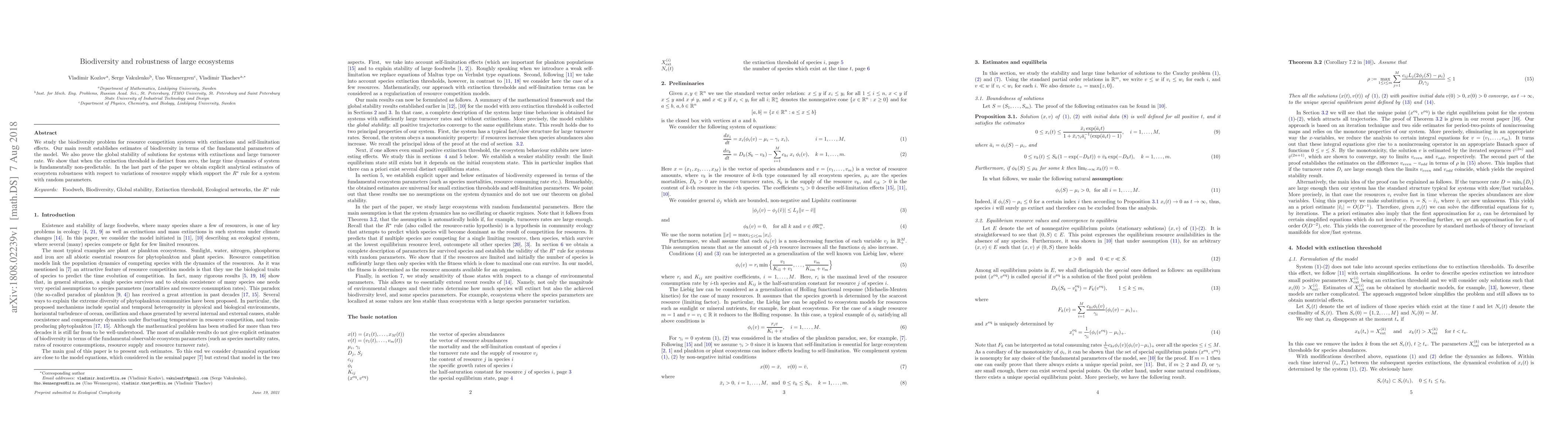 This paper studies biodiversity in resource competition systems with extinctions and self-limitation effects, finding that global stability is possible but large time dynamics can be unpredictable. It also introduces the $R^*$ rule for ecosystem robustness to variations in resource supply.