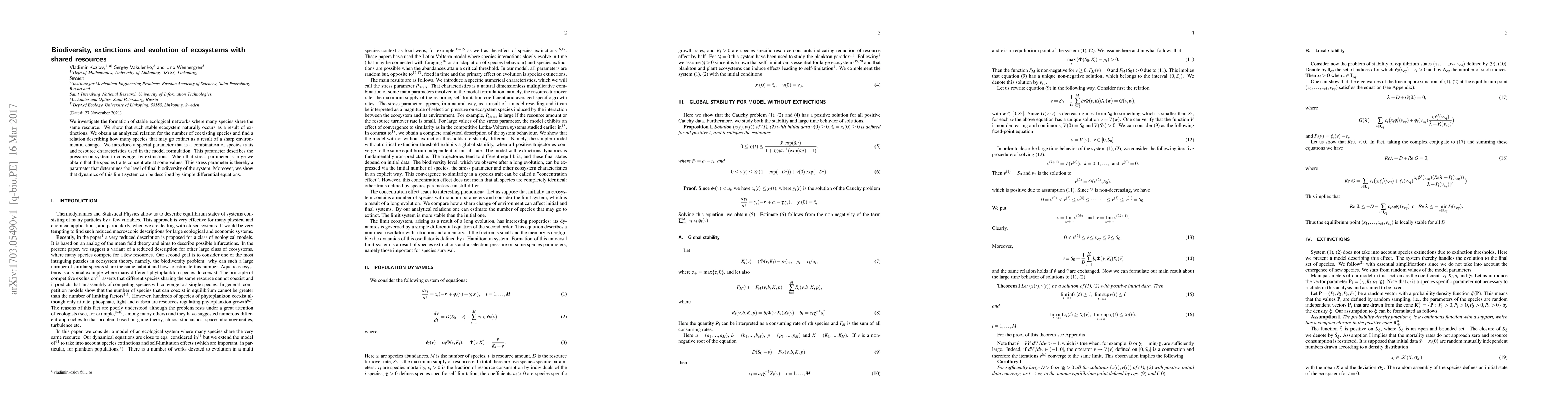 We investigate the formation of stable ecological networks where many species share the same resource. We show that such stable ecosystem naturally occurs as a result of extinctions. We obtain an analytical relation for the number of coexisting species and find a relation describing how many species that may go extinct as a result of a sharp environmental change. We introduce a special parameter that is a combination of species traits and resource characteristics used in the model formulation. This parameter describes the pressure on system to converge, by extinctions. When that stress parameter is large we obtain that the species traits concentrate at some values. This stress parameter is thereby a parameter that determines the level of final biodiversity of the system. Moreover, we show that dynamics of this limit system can be described by simple differential equations.