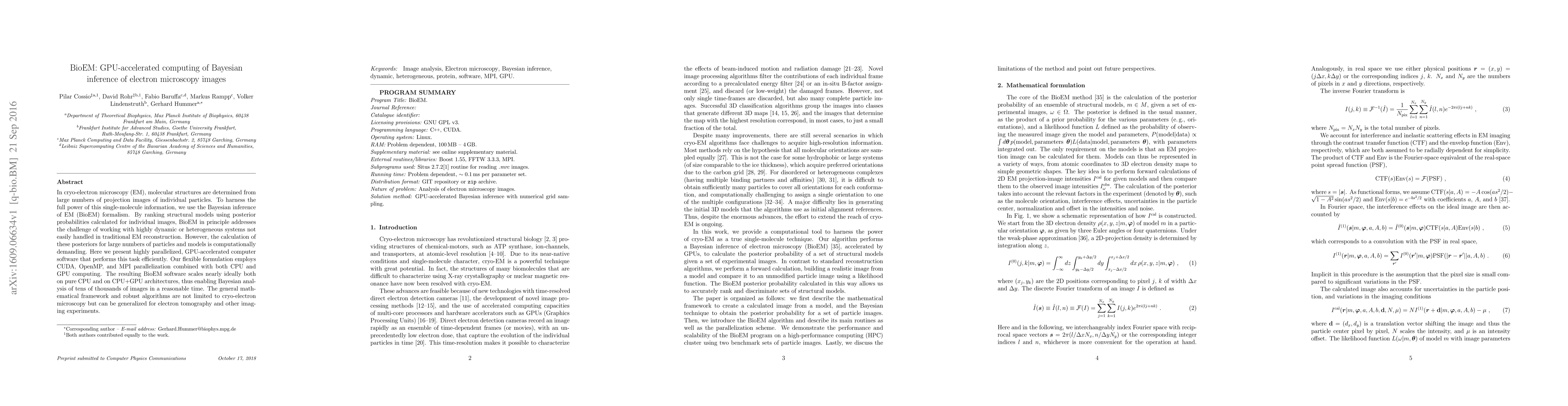 This paper introduces BioEM, a GPU-accelerated software for Bayesian inference in cryo-electron microscopy, enabling efficient analysis of large datasets. The software leverages parallel computing techniques to handle the computational demands of ranking structural models, thus facilitating the study of dynamic or heterogeneous systems.