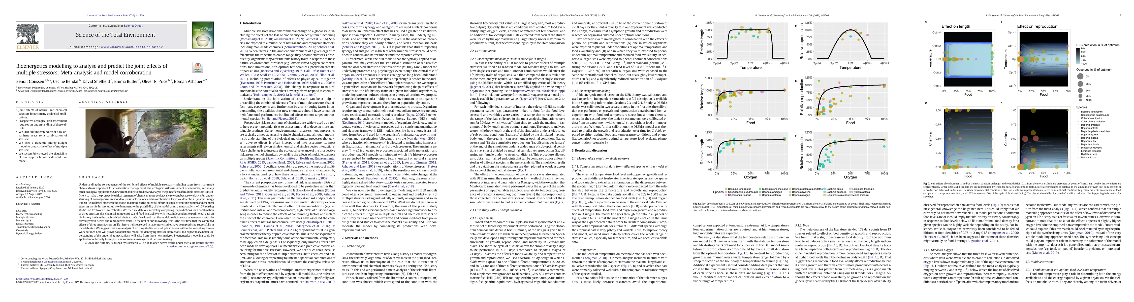 Understanding the consequences of the combined effects of multiple stressors-including stress from man-made chemicals is important for conservation management, the ecological risk assessment of chemicals, and many other ecological applications. Our current ability to predict and analyse the joint effects of multiple stressors is insufficient to make the prospective risk assessment of chemicals more ecologically relevant because we lack a full understanding of how organisms respond to stress factors alone and in combination. Here, we describe a Dynamic Energy Budget (DEB) based bioenergetics model that predicts the potential effects of single or multiple natural and chemical stressors on life history traits. We demonstrate the plausibility of the model using a meta-analysis of 128 existing studies on freshwater invertebrates. We then validate our model by comparing its predictions for a combination of three stressors (i.e. chemical, temperature, and food availability) with new, independent experimental data on life history traits in the daphnid Ceriodaphnia dubia. We found that the model predictions are in agreement with observed growth curves and reproductive traits. To the best of our knowledge, this is the first time that the combined effects of three stress factors on life history traits observed in laboratory studies have been predicted successfully in invertebrates. We suggest that a re-analysis of existing studies on multiple stressors within the modelling framework outlined here will provide a robust null model for identifying stressor interactions, and expect that a better understanding of the underlying mechanisms will arise from these new analyses. Bioenergetics modelling could be applied more broadly to support environmental management decision making.
