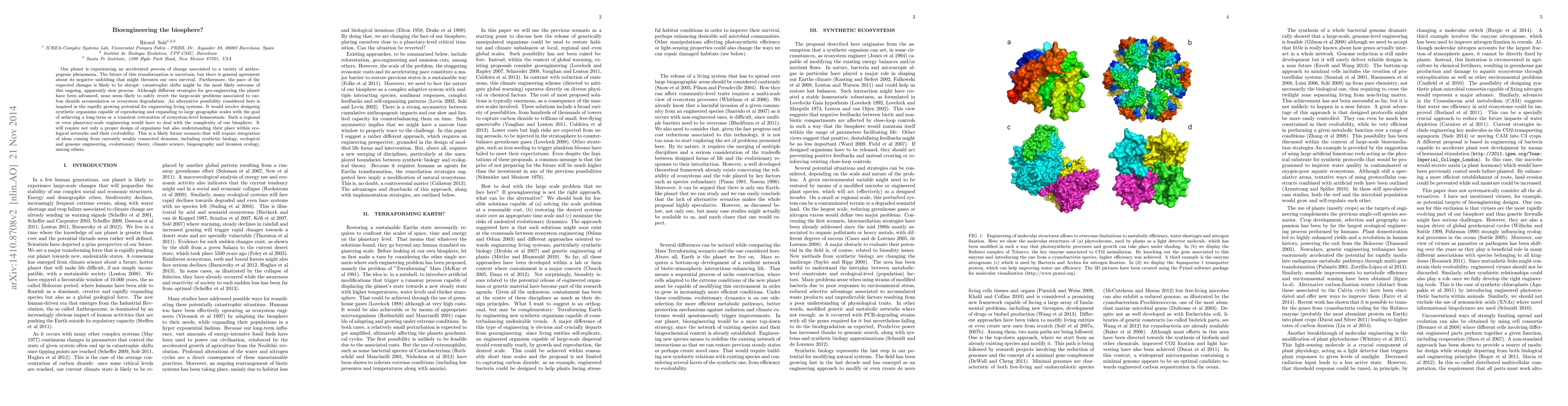 Our planet is experiencing an accelerated process of change associated to a variety of anthropogenic phenomena. The future of this transformation is uncertain, but there is general agreement about its negative unfolding that might threaten our own survival. Furthermore, the pace of the expected changes is likely to be abrupt: catastrophic shifts might be the most likely outcome of this ongoing, apparently slow process. Although different strategies for geo-engineering the planet have been advanced, none seem likely to safely revert the large-scale problems associated to carbon dioxide accumulation or ecosystem degradation. An alternative possibility considered here is inspired in the rapidly growing potential for engineering living systems. It would involve designing synthetic organisms capable of reproducing and expanding to large geographic scales with the goal of achieving a long-term or a transient restoration of ecosystem-level homeostasis. Such a regional or even planetary-scale engineering would have to deal with the complexity of our biosphere. It will require not only a proper design of organisms but also understanding their place within ecological networks and their evolvability. This is a likely future scenario that will require integration of ideas coming from currently weakly connected domains, including synthetic biology, ecological and genome engineering, evolutionary theory, climate science, biogeography and invasion ecology, among others.
