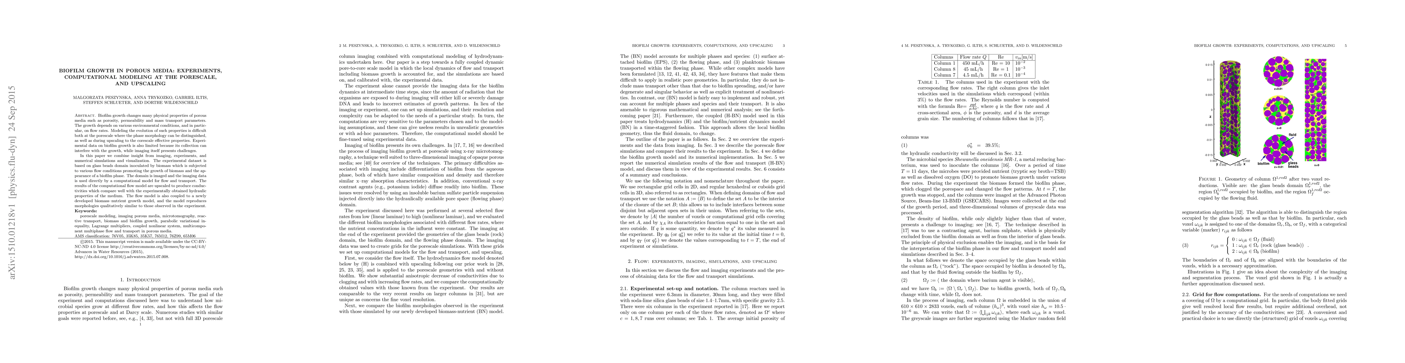 Biofilm growth changes many physical properties of porous media such as porosity, permeability and mass transport parameters. The growth depends on various environmental conditions, and in particular, on flow rates. Modeling the evolution of such properties is difficult both at the porescale where the phase morphology can be distinguished, as well as during upscaling to the corescale effective properties. Experimental data on biofilm growth is also limited because its collection can interfere with the growth, while imaging itself presents challenges. In this paper we combine insight from imaging, experiments, and numerical simulations and visualization. The experimental dataset is based on glass beads domain inoculated by biomass which is subjected to various flow conditions promoting the growth of biomass and the appearance of a biofilm phase. The domain is imaged and the imaging data is used directly by a computational model for flow and transport. The results of the computational flow model are upscaled to produce conductivities which compare well with the experimentally obtained hydraulic properties of the medium. The flow model is also coupled to a newly developed biomass--nutrient growth model, and the model reproduces morphologies qualitatively similar to those observed in the experiment.