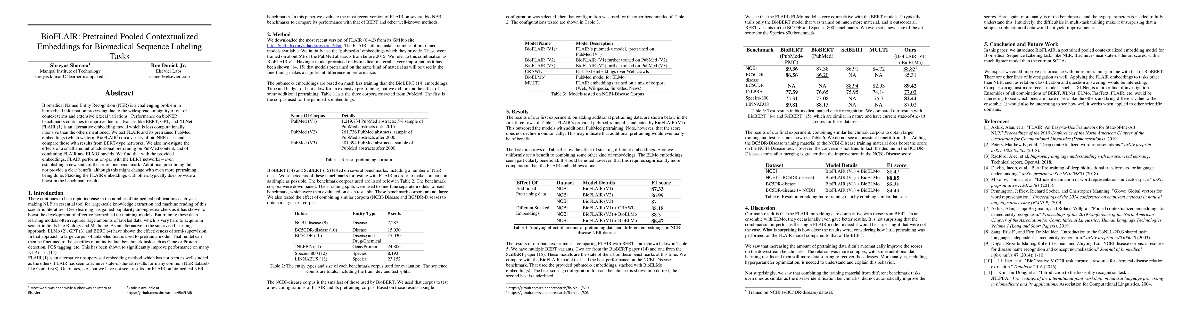 BioFLAIR, a pretrained pooled contextualized embedding model based on FLAIR, achieves competitive performance on biomedical named entity recognition tasks compared to BERT-type networks, sometimes even setting new benchmarks. Combining FLAIR with ELMO embeddings often yields further improvements.