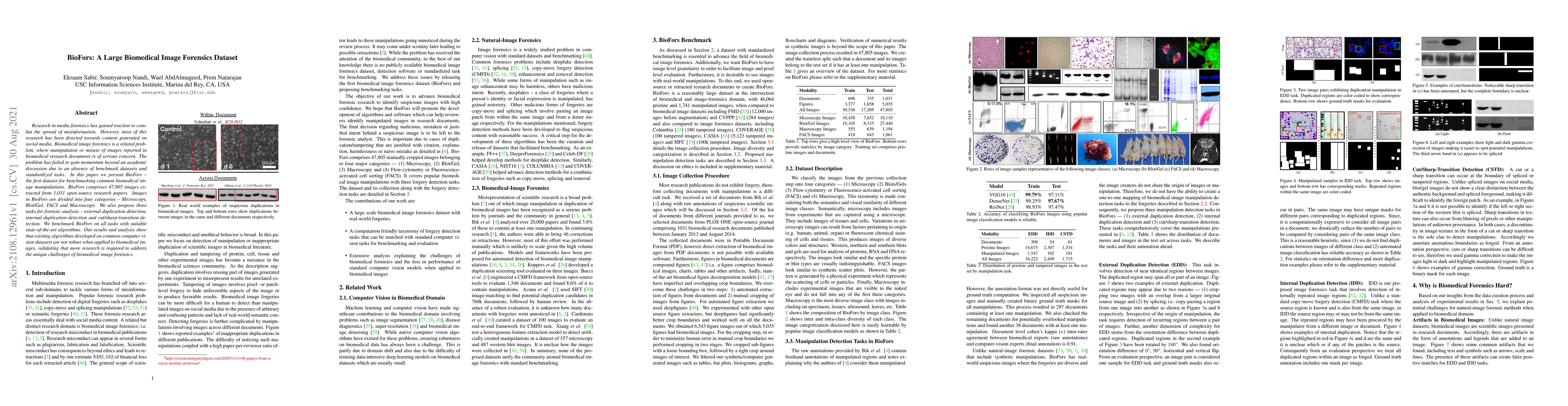 BioFors is a new dataset for benchmarking biomedical image manipulations, comprising 47,805 images from 1,031 research papers, divided into four categories. The dataset is used to propose and evaluate tasks for forensic analysis, revealing that current computer vision algorithms lack robustness for biomedical images, highlighting the need for specialized research.