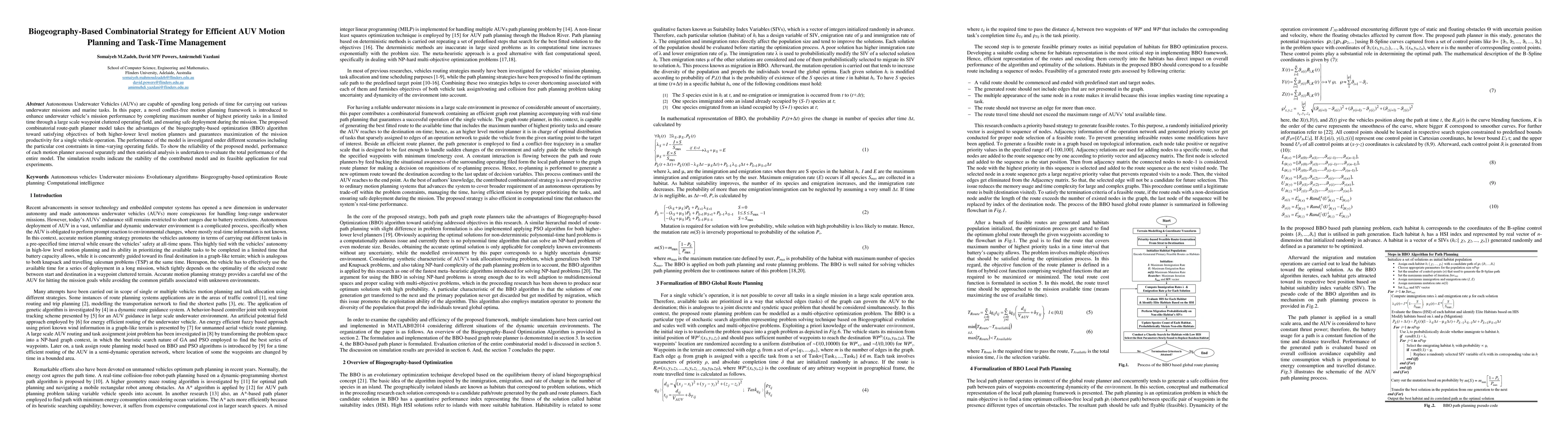 This paper introduces a biogeography-based combinatorial strategy for efficient AUV motion planning and task-time management, aiming to maximize mission productivity by prioritizing tasks in a cluttered environment. The proposed model integrates BBO for optimal route-path planning, and simulation results demonstrate its stability and potential for real-world applications.