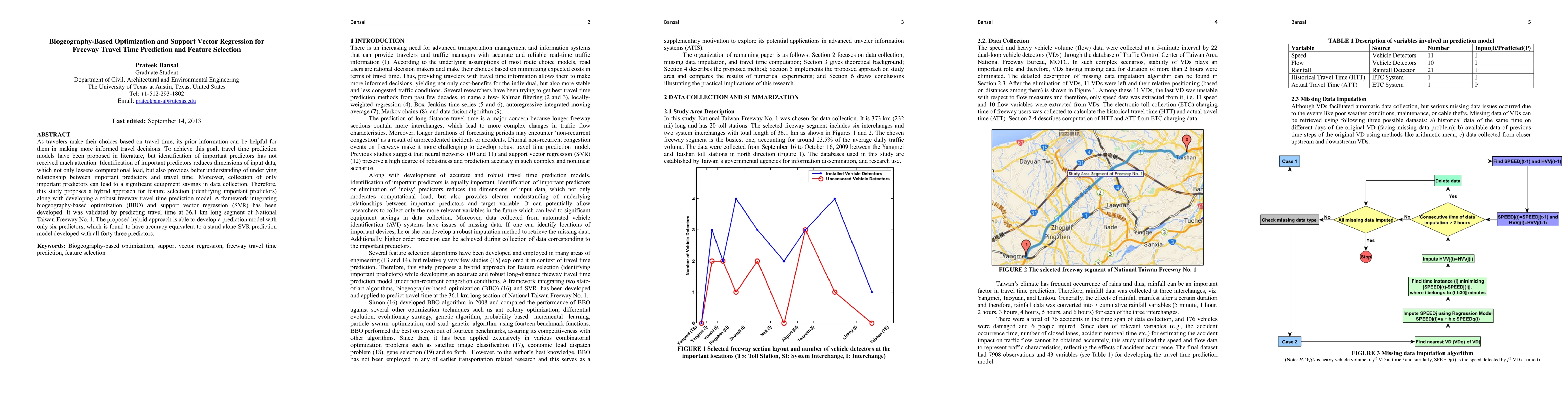 This study proposes a hybrid framework using biogeography-based optimization (BBO) and support vector regression (SVR) for freeway travel time prediction and feature selection. The model identifies six key predictors, achieving prediction accuracy comparable to a model using all forty-three predictors, thus reducing computational load and data collection costs.