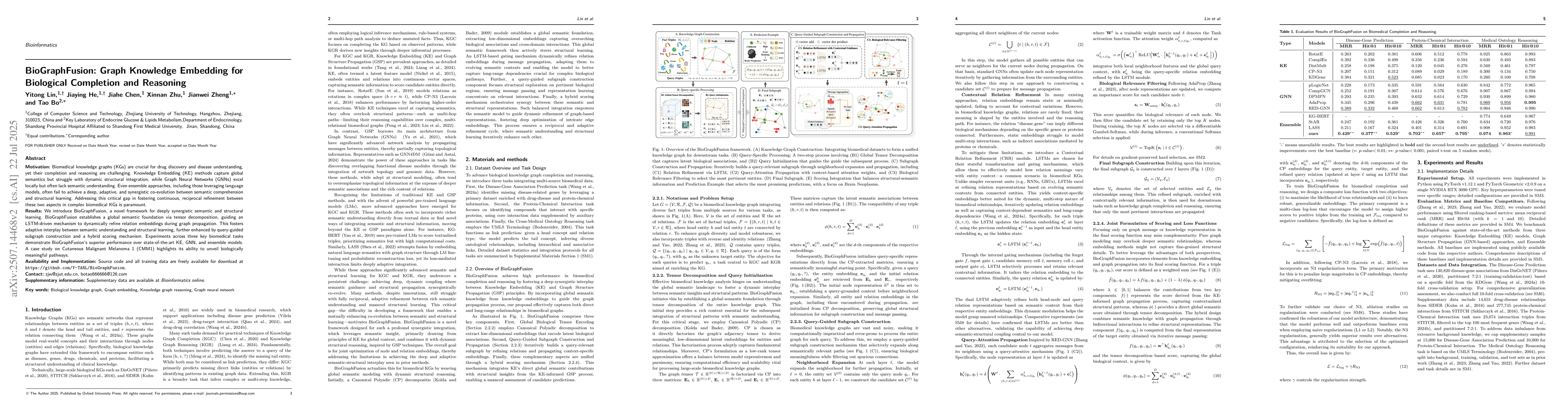 Motivation: Biomedical knowledge graphs (KGs) are crucial for drug discovery and disease understanding, yet their completion and reasoning are challenging. Knowledge Embedding (KE) methods capture global semantics but struggle with dynamic structural integration, while Graph Neural Networks (GNNs) excel locally but often lack semantic understanding. Even ensemble approaches, including those leveraging language models, often fail to achieve a deep, adaptive, and synergistic co-evolution between semantic comprehension and structural learning. Addressing this critical gap in fostering continuous, reciprocal refinement between these two aspects in complex biomedical KGs is paramount. Results: We introduce BioGraphFusion, a novel framework for deeply synergistic semantic and structural learning. BioGraphFusion establishes a global semantic foundation via tensor decomposition, guiding an LSTM-driven mechanism to dynamically refine relation embeddings during graph propagation. This fosters adaptive interplay between semantic understanding and structural learning, further enhanced by query-guided subgraph construction and a hybrid scoring mechanism. Experiments across three key biomedical tasks demonstrate BioGraphFusion's superior performance over state-of-the-art KE, GNN, and ensemble models. A case study on Cutaneous Malignant Melanoma 1 (CMM1) highlights its ability to unveil biologically meaningful pathways. Availability and Implementation: Source code and all training data are freely available for download at https://github.com/Y-TARL/BioGraphFusion. Supplementary information: Supplementary data are available at Bioinformatics online.