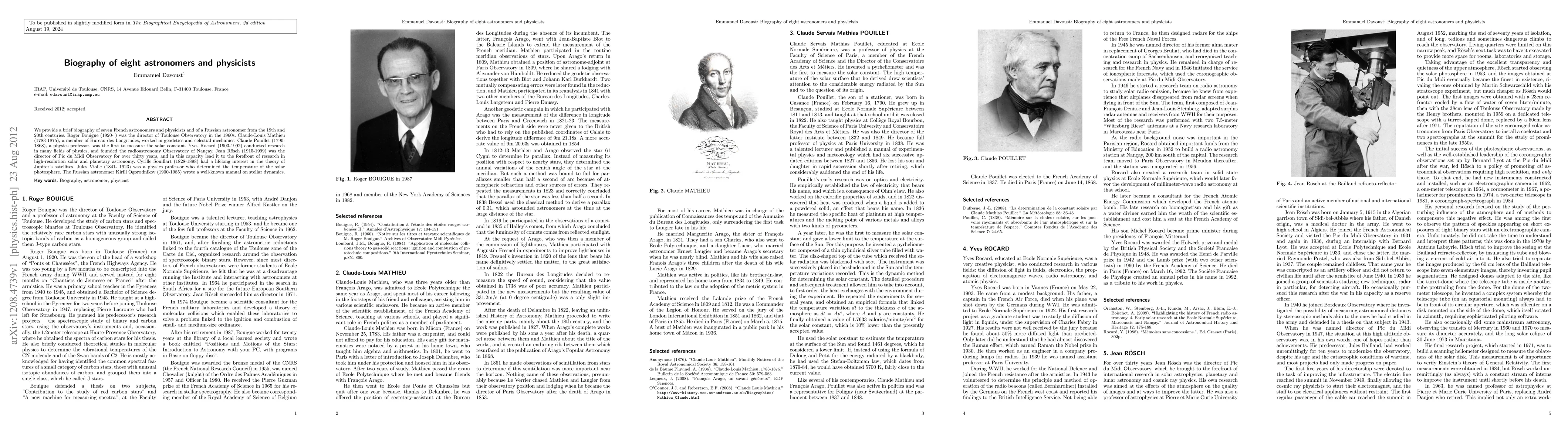 We provide a brief biography of seven French astronomers and physicists and of a Russian astronomer from the 19th and 20th centuries. Roger Bouigue (1920-) was the director of Toulouse Observatory in the 1960s. Claude-Louis Mathieu (1783-1875), a member of Bureau des Longitudes, worked in geodetics and celestial mechanics. Claude Pouillet (1790-1868), a physics professor, was the first to measure the solar constant. Yves Rocard (1903-1992) conducted research in many fields of physics, and founded the radioastronomy Observatory of Nancay. Jean Rosch (1915-1999) was the director of Pic du Midi Observatory for over thirty years, and in this capacity lead it to the forefront of research in high-resolution solar and planetary astronomy. Cyrille Souillart (1828-1898) had a lifelong interest in the theory of Jupiter's satellites. Jules Violle (1841- 1923) was a physics professor who determined the temperature of the solar photosphere. The Russian astronomer Kirill Ogorodnikov (1900-1985) wrote a well-known manual on stellar dynamics.