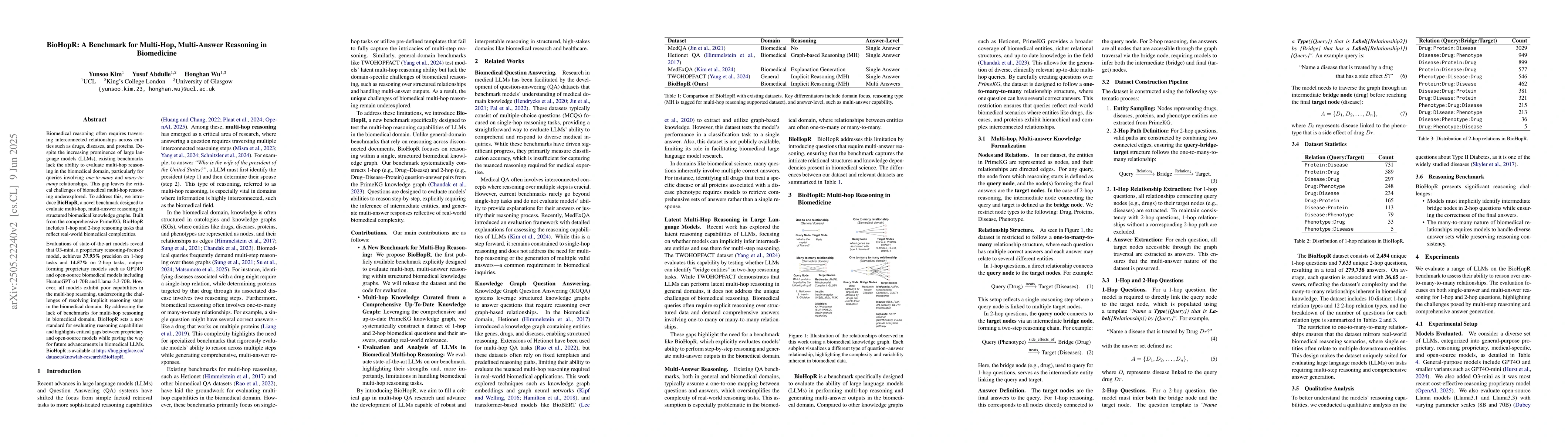 A new benchmark called BioHopR evaluates multi-hop reasoning in biomedical domain with 1-hop and 2-hop tasks, outperforming existing models with high precision rates, highlighting critical gaps between proprietary and open-source models.