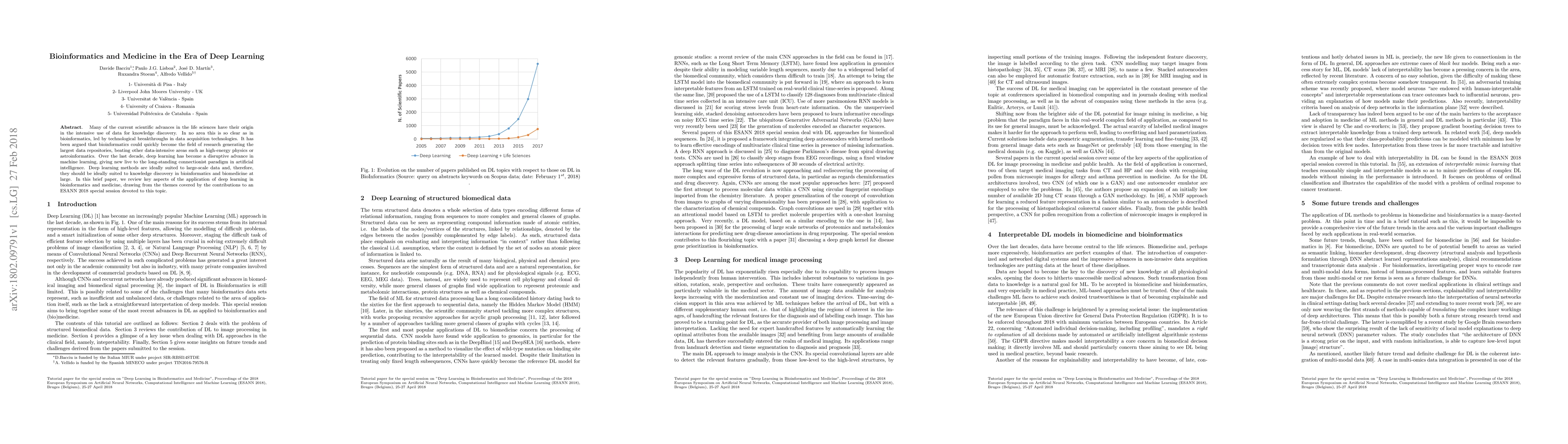 Many of the current scientific advances in the life sciences have their origin in the intensive use of data for knowledge discovery. In no area this is so clear as in bioinformatics, led by technological breakthroughs in data acquisition technologies. It has been argued that bioinformatics could quickly become the field of research generating the largest data repositories, beating other data-intensive areas such as high-energy physics or astroinformatics. Over the last decade, deep learning has become a disruptive advance in machine learning, giving new live to the long-standing connectionist paradigm in artificial intelligence. Deep learning methods are ideally suited to large-scale data and, therefore, they should be ideally suited to knowledge discovery in bioinformatics and biomedicine at large. In this brief paper, we review key aspects of the application of deep learning in bioinformatics and medicine, drawing from the themes covered by the contributions to an ESANN 2018 special session devoted to this topic.