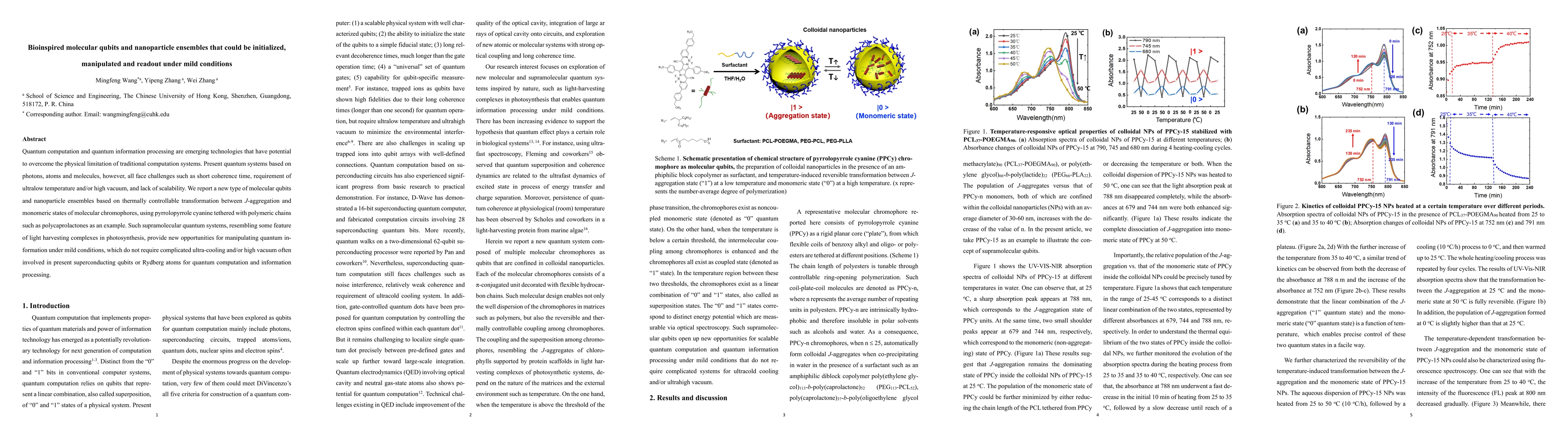 Quantum computation and quantum information processing are emerging technologies that have potential to overcome the physical limitation of traditional computation systems. Present quantum systems based on photons, atoms and molecules, however, all face challenges such as short coherence time, requirement of ultralow temperature and/or high vacuum, and lack of scalability. We report a new type of molecular qubits and nanoparticle ensembles based on thermally controllable transformation between J-aggregation and monomeric states of molecular chromophores, using pyrrolopyrrole cyanine tethered with polymeric chains such as polycaprolactones as an example. Such supramolecular quantum systems, resembling some feature of light harvesting complexes in photosynthesis, provide new opportunities for manipulating quantum in-formation under mild conditions, which do not require complicated ultra-cooling and/or high vacuum often involved in present superconducting qubits or Rydberg atoms for quantum computation and information processing.