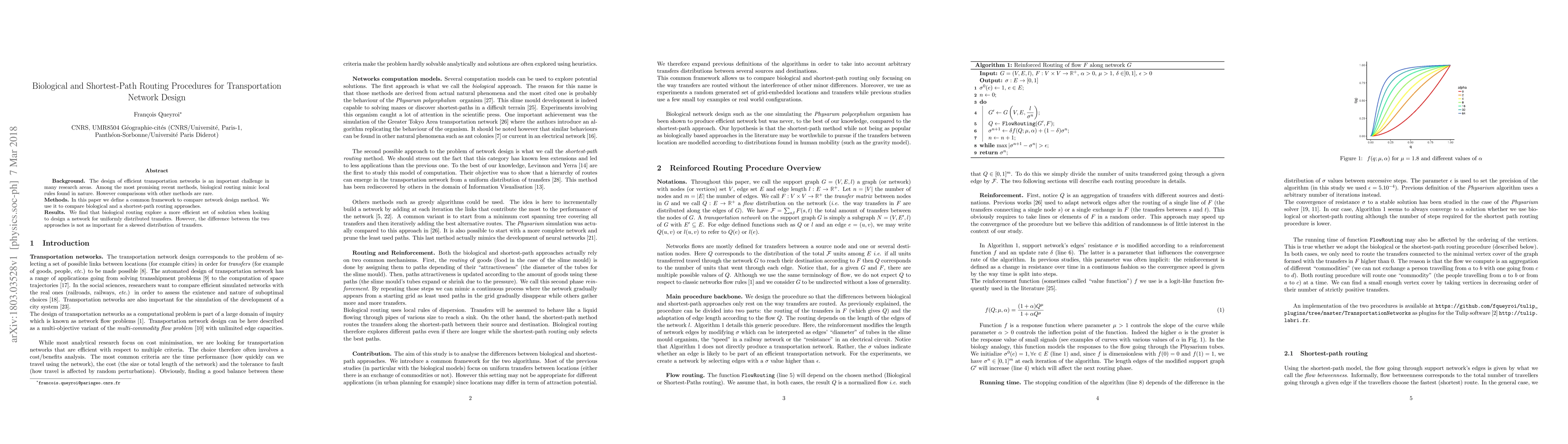 This paper compares biological routing methods, which mimic natural local rules, with shortest-path routing in designing transportation networks. It finds that biological routing is more efficient for uniformly distributed transfers, while the difference is less significant for skewed distributions.