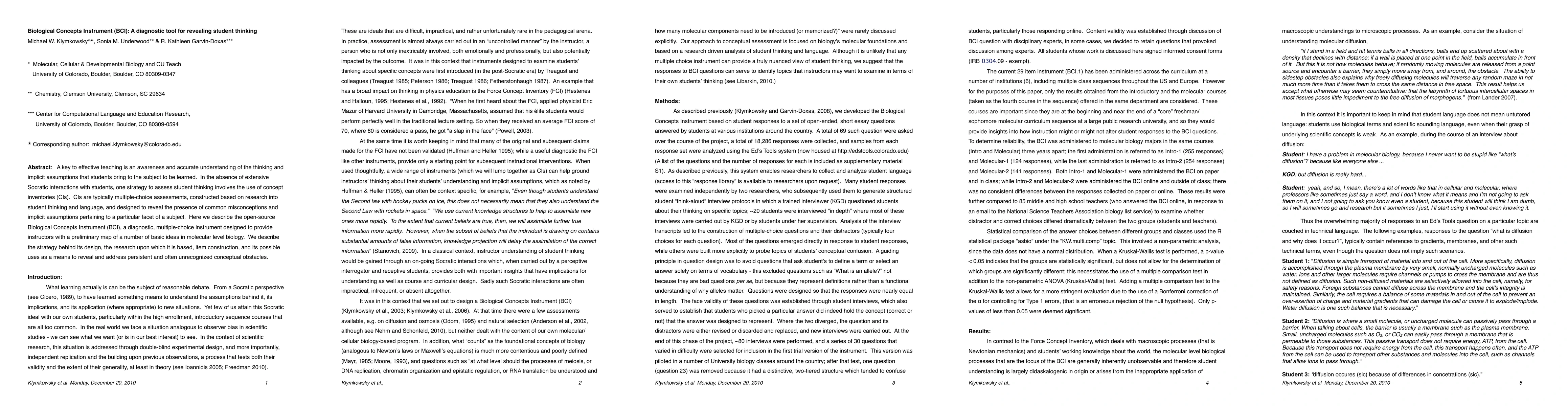 A key to effective teaching is an awareness and accurate understanding of the thinking and implicit assumptions that students bring to the subject to be learned. In the absence of extensive Socratic interactions with students, one strategy to assess student thinking involves the use of concept inventories (CIs). CIs are typically multiple-choice assessments, constructed based on research into student thinking and language, and designed to reveal the presence of common misconceptions and implicit assumptions pertaining to a particular facet of a subject. Here we describe the open-source Biological Concepts Instrument (BCI), a diagnostic, multiple-choice instrument designed to provide instructors with a preliminary map of a number of basic ideas in molecular level biology. We describe the strategy behind its design, the research upon which it is based, item construction, and its possible uses as a means to reveal and address persistent and often unrecognized conceptual obstacles.