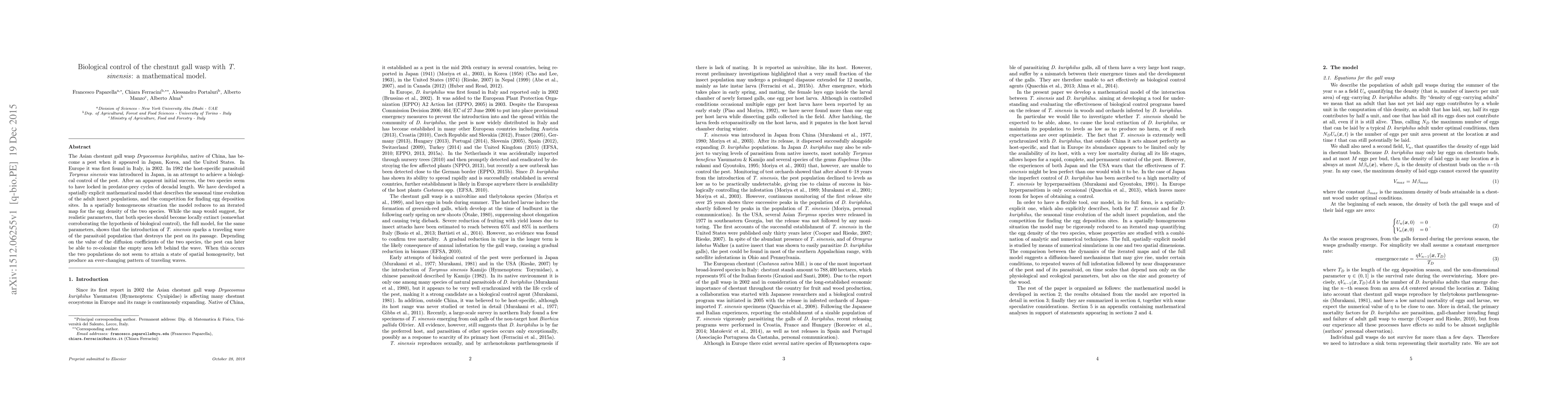 The Asian chestnut gall wasp \emph{Dryocosmus kuriphilus}, native of China, has become a pest when it appeared in Japan, Korea, and the United States. In Europe it was first found in Italy, in 2002. In 1982 the host-specific parasitoid \emph{Torymus sinensis} was introduced in Japan, in an attempt to achieve a biological control of the pest. After an apparent initial success, the two species seem to have locked in predator-prey cycles of decadal length. We have developed a spatially explicit mathematical model that describes the seasonal time evolution of the adult insect populations, and the competition for finding egg deposition sites. In a spatially homogeneous situation the model reduces to an iterated map for the egg density of the two species. While the map would suggest, for realistic parameters, that both species should become locally extinct (somewhat corroborating the hypothesis of biological control), the full model, for the same parameters, shows that the introduction of \emph{T. sinensis} sparks a traveling wave of the parasitoid population that destroys the pest on its passage. Depending on the value of the diffusion coefficients of the two species, the pest can later be able to re-colonize the empty area left behind the wave. When this occurs the two populations do not seem to attain a state of spatial homogeneity, but produce an ever-changing pattern of traveling waves.