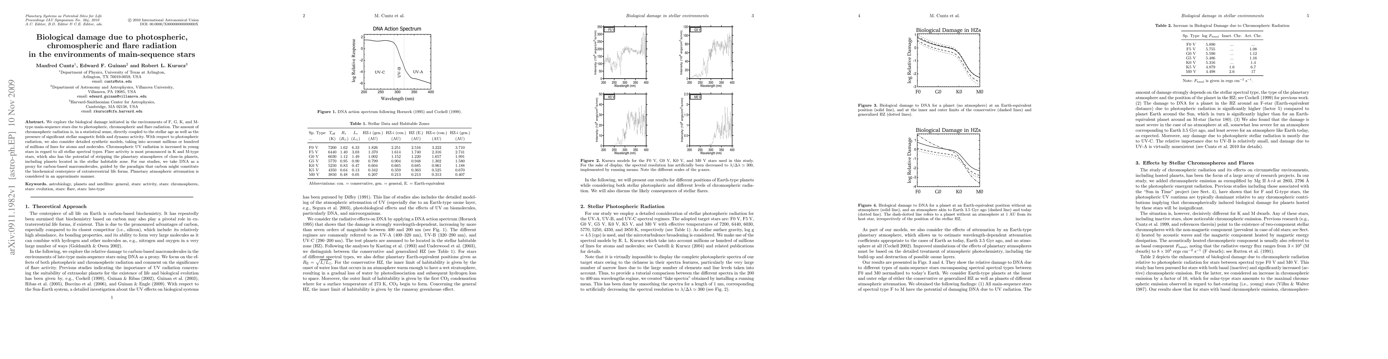 This paper investigates the biological damage caused by photospheric, chromospheric, and flare radiation from F, G, K, and M-type main-sequence stars, focusing on DNA as a proxy for carbon-based life forms. It highlights the increased chromospheric UV radiation in young stars and the potential atmospheric stripping effects of flare activity, particularly in K and M-type stars.