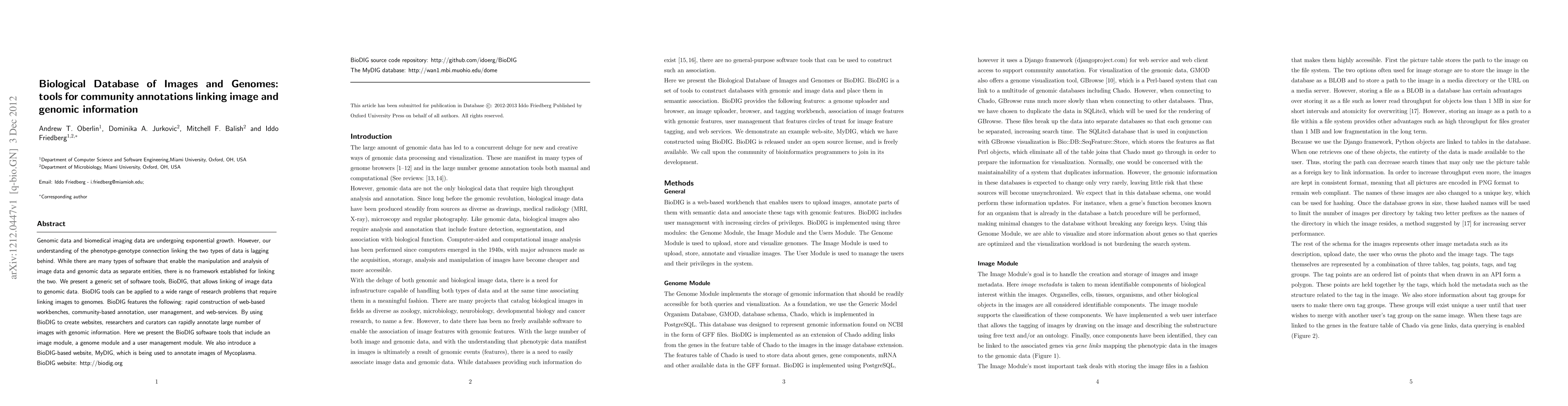 The paper presents BioDIG, a suite of software tools designed to link genomic data with biomedical imaging data, facilitating community annotations and enhancing the understanding of phenotype-genotype connections. BioDIG includes modules for image, genome, and user management, enabling rapid web-based annotation of large image datasets with genomic information.
