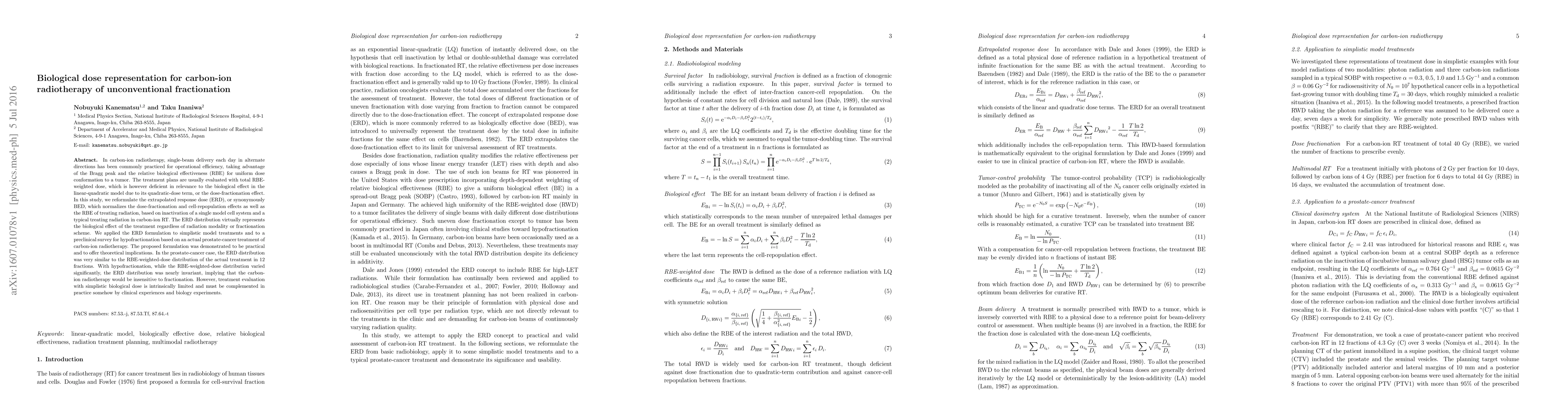 In carbon-ion radiotherapy, single-beam delivery each day in alternate directions has been commonly practiced for operational efficiency, taking advantage of the Bragg peak and the relative biological effectiveness (RBE) for uniform dose conformation to a tumor. The treatment plans are usually evaluated with total RBE-weighted dose, which is however deficient in relevance to the biological effect in the linear-quadratic model due to its quadratic-dose term, or the dose-fractionation effect. In this study, we reformulate the extrapolated response dose (ERD), or synonymously BED, which normalizes the dose-fractionation and cell-repopulation effects as well as the RBE of treating radiation, based on inactivation of a single model cell system and a typical treating radiation in carbon-ion RT. The ERD distribution virtually represents the biological effect of the treatment regardless of radiation modality or fractionation scheme. We applied the ERD formulation to simplistic model treatments and to a preclinical survey for hypofractionation based on an actual prostate-cancer treatment of carbon-ion radiotherapy. The proposed formulation was demonstrated to be practical and to offer theoretical implications. In the prostate-cancer case, the ERD distribution was very similar to the RBE-weighted-dose distribution of the actual treatment in 12 fractions. With hypofractionation, while the RBE-weighted-dose distribution varied significantly, the ERD distribution was nearly invariant, implying that the carbon-ion radiotherapy would be insensitive to fractionation. However, treatment evaluation with simplistic biological dose is intrinsically limited and must be complemented in practice somehow by clinical experiences and biology experiments.