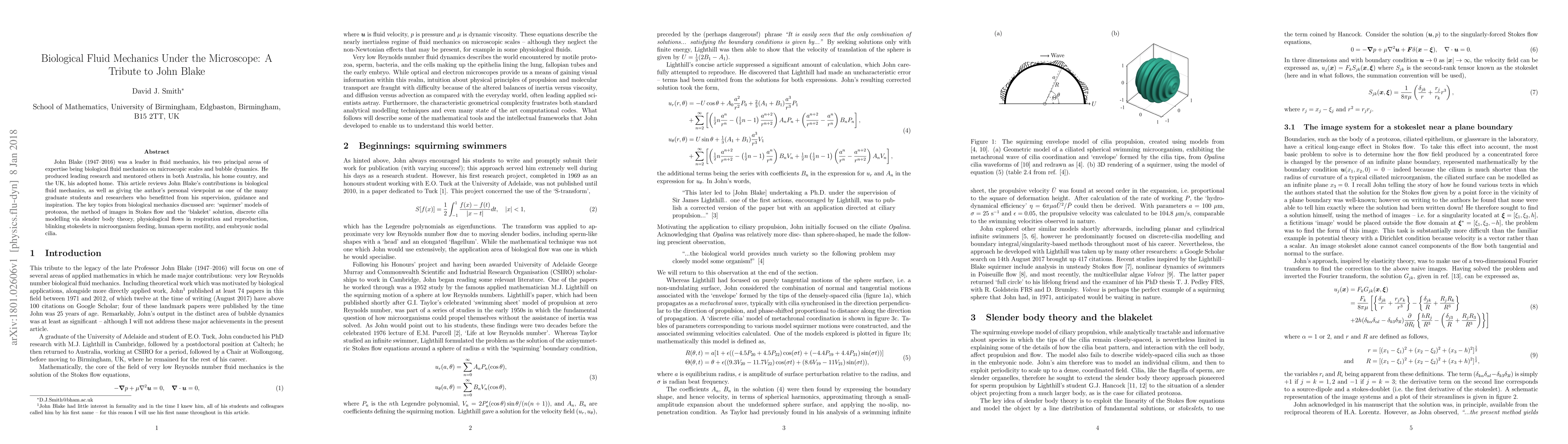This paper honors John Blake's pioneering work in biological fluid mechanics, focusing on microscopic scales, and highlights his contributions to 'squirmer' models, image method in Stokes flow, and human sperm motility, among other topics, while reflecting on his mentorship impact.