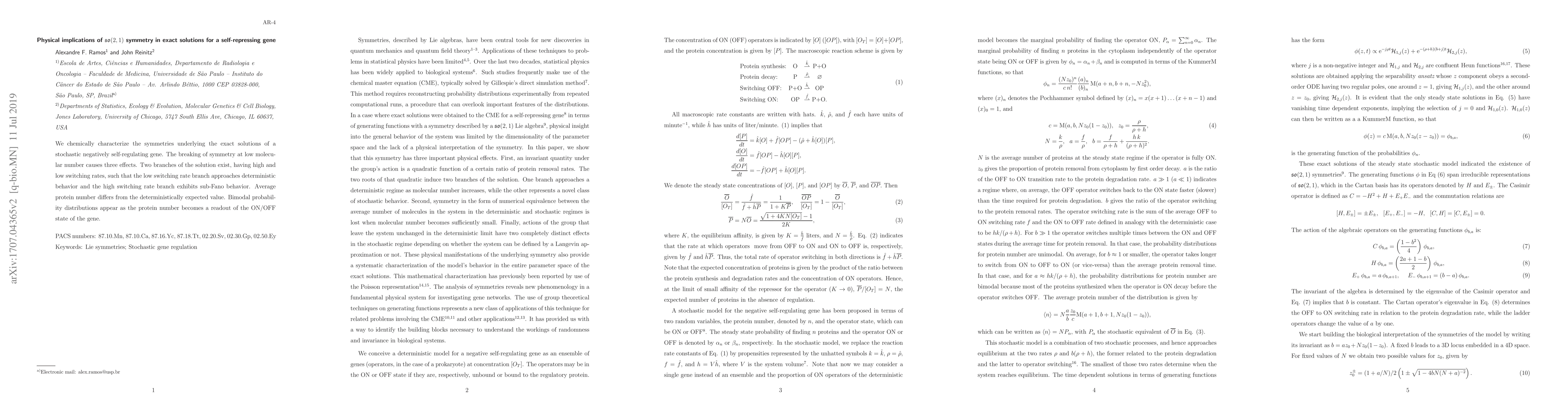 We chemically characterize the symmetries underlying the exact solutions of a stochastic negatively self-regulating gene. The breaking of symmetry at low molecular number causes three effects. Two branches of the solution exist, having high and low switching rates, such that the low switching rate branch approaches deterministic behavior and the high switching rate branch exhibits sub-Fano behavior. Average protein number differs from the deterministically expected value. Bimodal probability distributions appear as the protein number becomes a readout of the ON/OFF state of the gene.