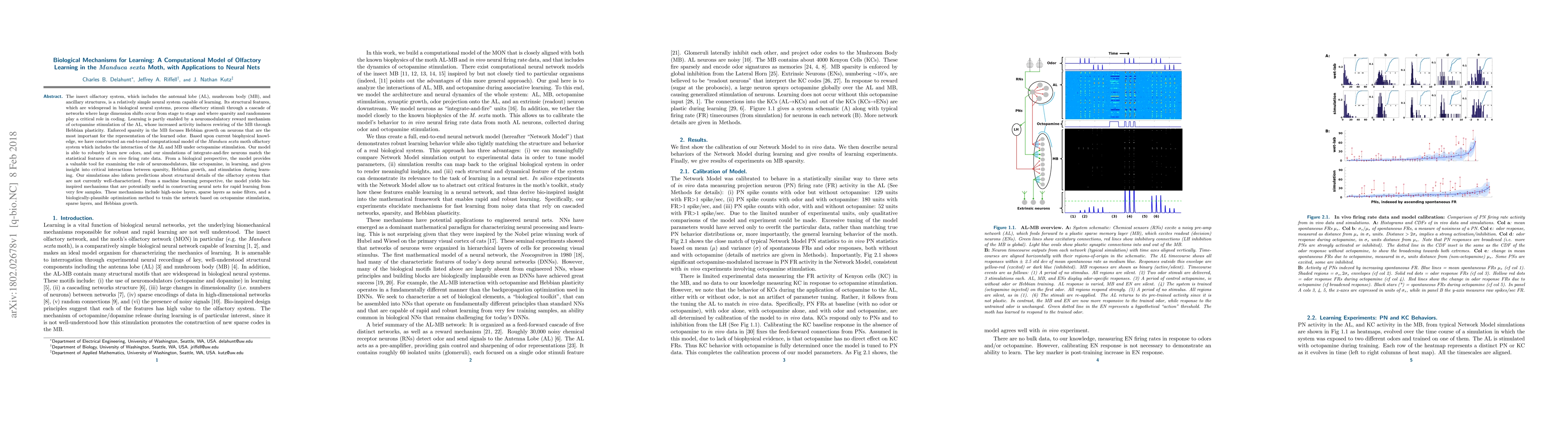 This study develops a computational model of the Manduca sexta moth olfactory system that learns to recognize new odors through a biologically-inspired mechanism involving octopamine stimulation and sparse neural networks.