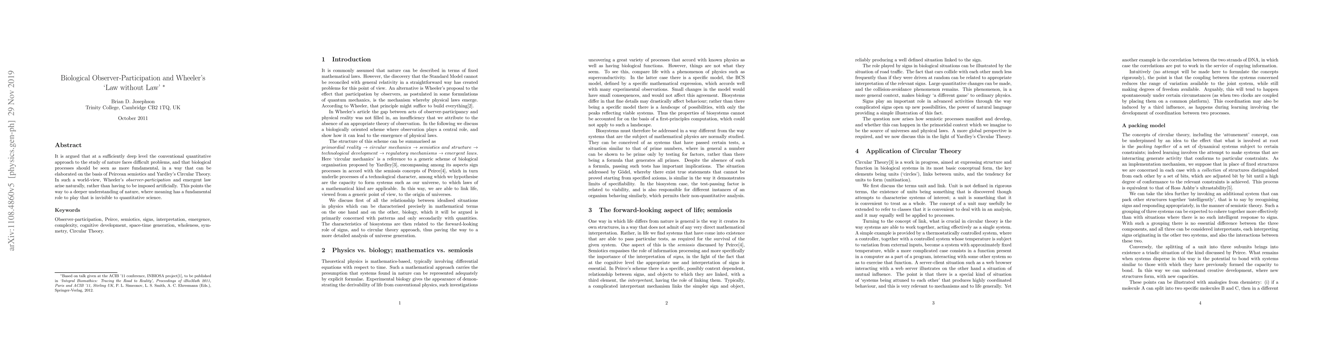 This paper argues that biological processes are more fundamental than conventional quantitative methods, suggesting that meaning and observer-participation, as per Peircean semiotics and Yardley's Circular Theory, provide a deeper understanding of nature where Wheeler's concept of emergent law naturally arises.