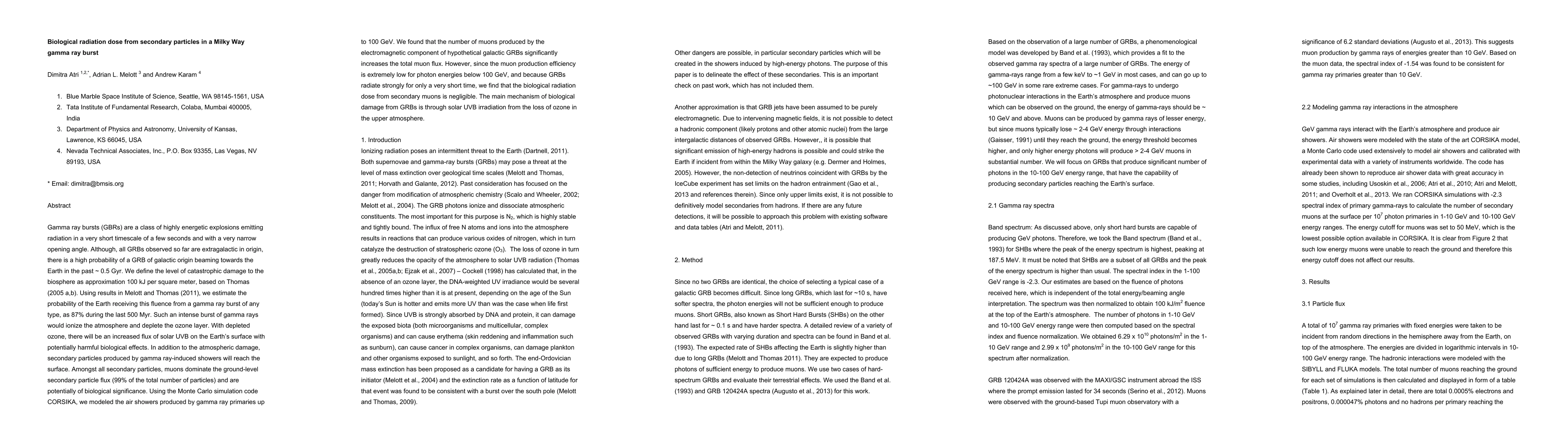 Gamma ray bursts (GBRs) are a class of highly energetic explosions emitting radiation in a very short timescale of a few seconds and with a very narrow opening angle. Although, all GRBs observed so far are extragalactic in origin, there is a high probability of a GRB of galactic origin beaming towards the Earth in the past ~ 0.5 Gyr. Such an intense burst of gamma rays would ionize the atmosphere and deplete the ozone layer. With depleted ozone, there will be an increased flux of solar UVB on the Earth's surface with harmful biological effects. In addition to the atmospheric damage, secondary particles produced by gamma ray-induced showers will reach the surface. Amongst all secondary particles, muons dominate the ground-level secondary particle flux (99% of the total number of particles) and are potentially of biological significance. Using the Monte Carlo simulation code CORSIKA, we modeled the air showers produced by gamma ray primaries up to 100 GeV. We found that the number of muons produced by hypothetical galactic GRBs significantly increases the total muon flux. However, since the muon production efficiency is extremely low for photon energy below 100 GeV, and because GRBs radiate strongly for only a very short time, we find that the biological radiation dose from secondary muons is negligible. The main mechanism of biological damage from GRBs is through solar UVB irradiation from the loss of ozone in the upper atmosphere.
