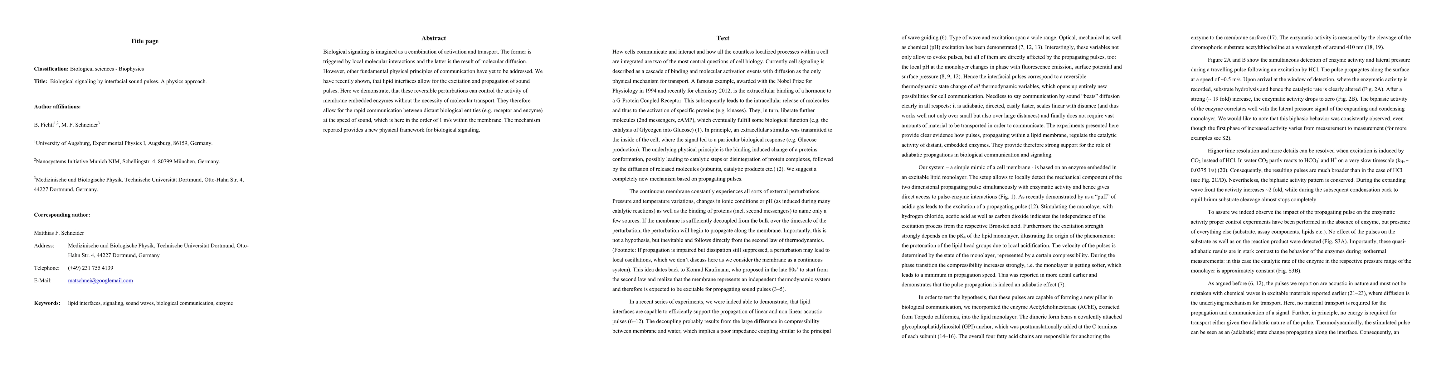 This paper explores a novel biological signaling mechanism using interfacial sound pulses within lipid membranes. These sound waves can activate membrane-embedded enzymes without molecular transport, enabling rapid communication between distant biological entities at the speed of sound, offering a new physical framework for understanding biological signaling.