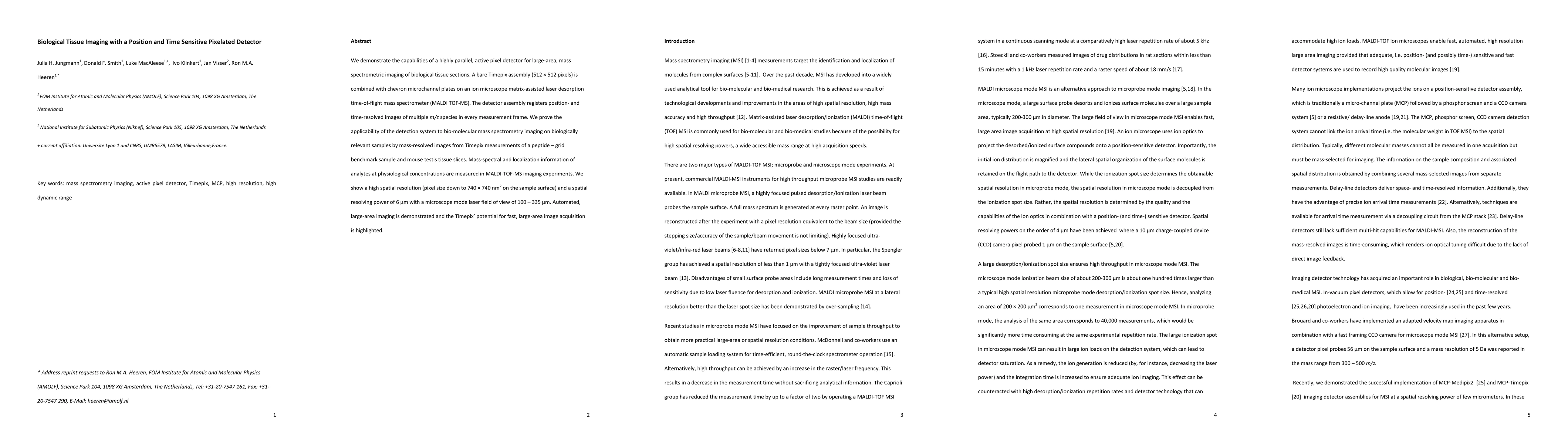 We demonstrate the capabilities of a highly parallel, active pixel detector for large-area, mass spectrometric imaging of biological tissue sections. A bare Timepix assembly (512x512 pixels) is combined with chevron microchannel plates on an ion microscope matrix-assisted laser desorption time-of-flight mass spectrometer (MALDI TOF-MS). The detector assembly registers position- and time-resolved images of multiple m/z species in every measurement frame. We prove the applicability of the detection system to bio-molecular mass spectrometry imaging on biologically relevant samples by mass-resolved images from Timepix measurements of a peptide-grid benchmark sample and mouse testis tissue slices. Mass-spectral and localization information of analytes at physiological concentrations are measured in MALDI-TOF-MS imaging experiments. We show a high spatial resolution (pixel size down to 740x740 nm2 on the sample surface) and a spatial resolving power of 6 {\mu}m with a microscope mode laser field of view of 100-335 {\mu}m. Automated, large-area imaging is demonstrated and the Timepix' potential for fast, large-area image acquisition is highlighted.