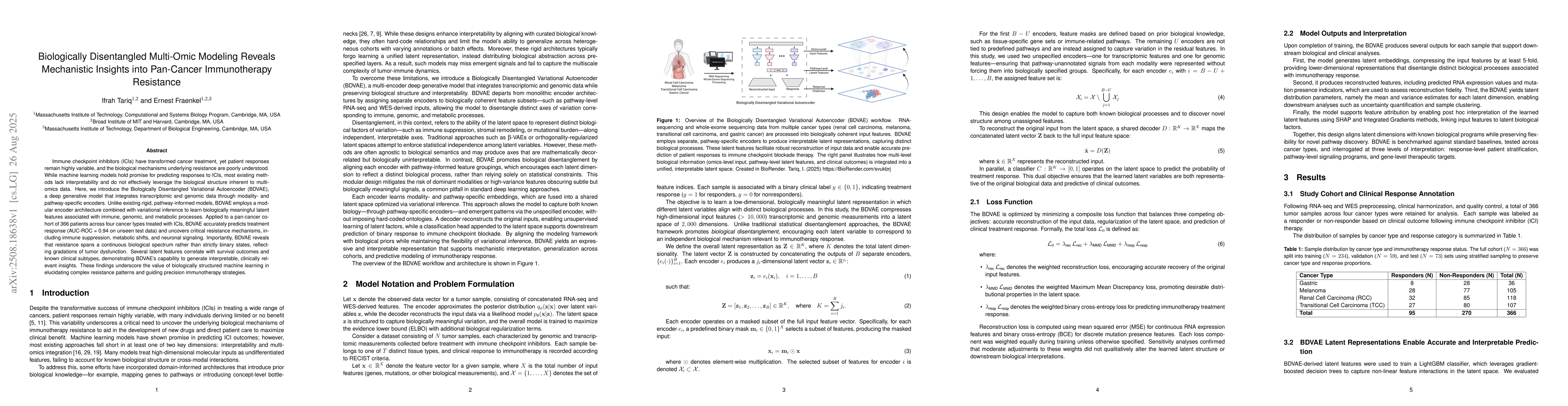 Immune checkpoint inhibitors (ICIs) have transformed cancer treatment, yet patient responses remain highly variable, and the biological mechanisms underlying resistance are poorly understood. While machine learning models hold promise for predicting responses to ICIs, most existing methods lack interpretability and do not effectively leverage the biological structure inherent to multi-omics data. Here, we introduce the Biologically Disentangled Variational Autoencoder (BDVAE), a deep generative model that integrates transcriptomic and genomic data through modality- and pathway-specific encoders. Unlike existing rigid, pathway-informed models, BDVAE employs a modular encoder architecture combined with variational inference to learn biologically meaningful latent features associated with immune, genomic, and metabolic processes. Applied to a pan-cancer cohort of 366 patients across four cancer types treated with ICIs, BDVAE accurately predicts treatment response (AUC-ROC = 0.94 on unseen test data) and uncovers critical resistance mechanisms, including immune suppression, metabolic shifts, and neuronal signaling. Importantly, BDVAE reveals that resistance spans a continuous biological spectrum rather than strictly binary states, reflecting gradations of tumor dysfunction. Several latent features correlate with survival outcomes and known clinical subtypes, demonstrating BDVAE's capability to generate interpretable, clinically relevant insights. These findings underscore the value of biologically structured machine learning in elucidating complex resistance patterns and guiding precision immunotherapy strategies.