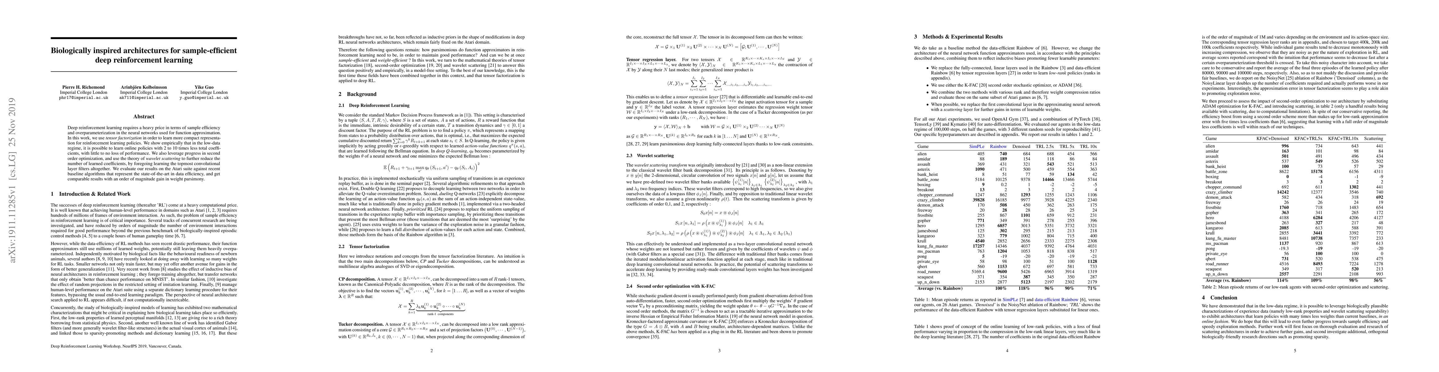 Deep reinforcement learning requires a heavy price in terms of sample efficiency and overparameterization in the neural networks used for function approximation. In this work, we use tensor factorization in order to learn more compact representation for reinforcement learning policies. We show empirically that in the low-data regime, it is possible to learn online policies with 2 to 10 times less total coefficients, with little to no loss of performance. We also leverage progress in second order optimization, and use the theory of wavelet scattering to further reduce the number of learned coefficients, by foregoing learning the topmost convolutional layer filters altogether. We evaluate our results on the Atari suite against recent baseline algorithms that represent the state-of-the-art in data efficiency, and get comparable results with an order of magnitude gain in weight parsimony.