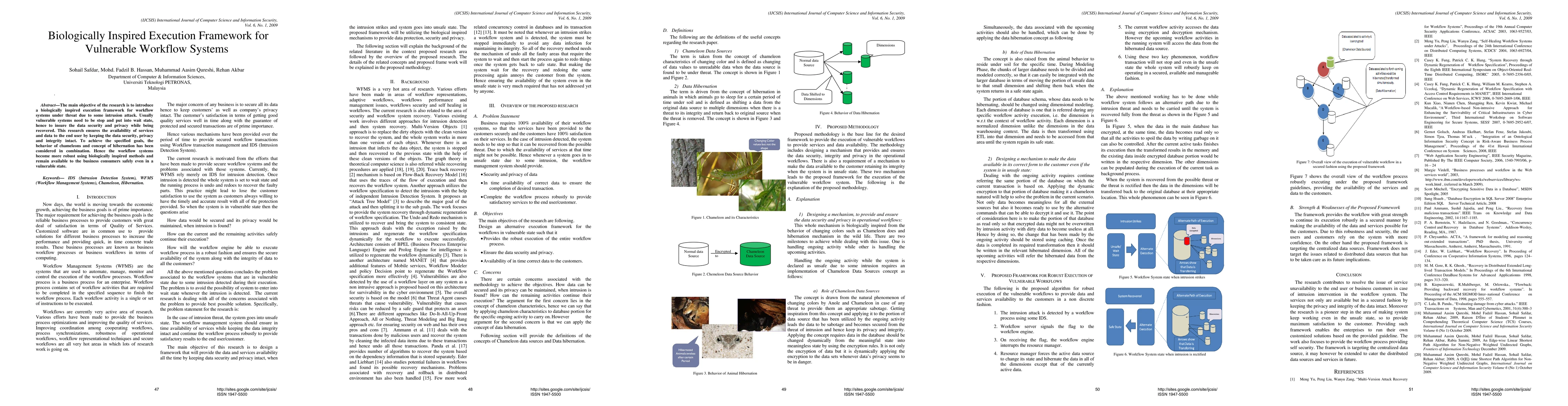 This research proposes a biologically inspired execution framework for workflow systems under attack, leveraging chameleon behavior and hibernation concepts to maintain data security, privacy, and integrity while ensuring service availability during recovery. The framework enhances system robustness and keeps business operations secure even in vulnerable states.