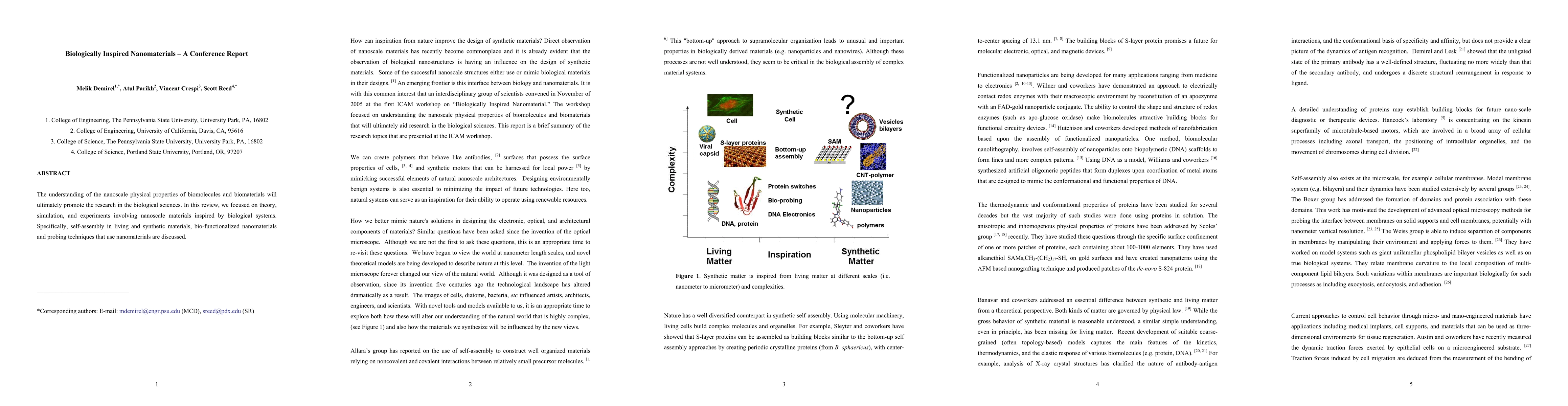 This conference report reviews theoretical, simulation, and experimental studies on nanoscale materials inspired by biological systems, focusing on self-assembly, bio-functionalized nanomaterials, and advanced probing techniques. The aim is to enhance research in biological sciences through insights into biomolecular and biomaterial properties at the nanoscale.