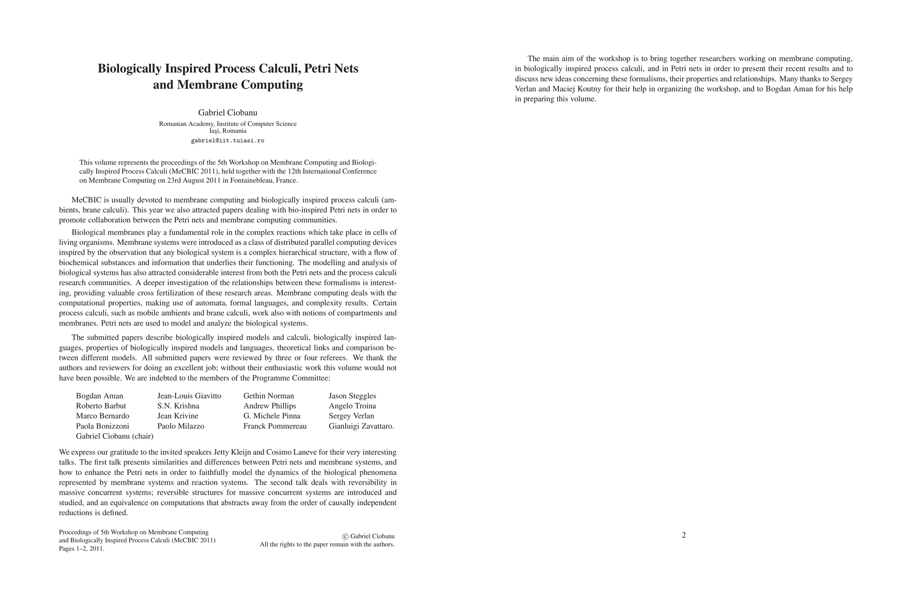 This paper discusses the proceedings of the 2011 MeCBIC workshop, focusing on biologically inspired process calculi, Petri nets, and membrane computing, held in conjunction with the 12th International Conference on Membrane Computing in Fontainebleau, France. It highlights the intersection of theoretical computer science and biological modeling.