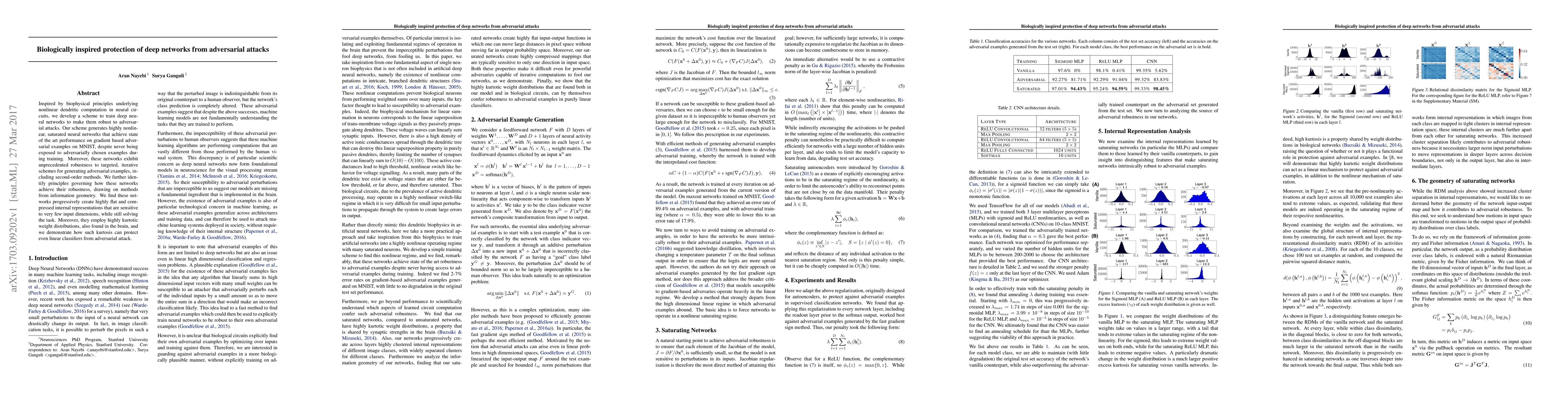 Inspired by biophysical principles underlying nonlinear dendritic computation in neural circuits, we develop a scheme to train deep neural networks to make them robust to adversarial attacks. Our scheme generates highly nonlinear, saturated neural networks that achieve state of the art performance on gradient based adversarial examples on MNIST, despite never being exposed to adversarially chosen examples during training. Moreover, these networks exhibit unprecedented robustness to targeted, iterative schemes for generating adversarial examples, including second-order methods. We further identify principles governing how these networks achieve their robustness, drawing on methods from information geometry. We find these networks progressively create highly flat and compressed internal representations that are sensitive to very few input dimensions, while still solving the task. Moreover, they employ highly kurtotic weight distributions, also found in the brain, and we demonstrate how such kurtosis can protect even linear classifiers from adversarial attack.