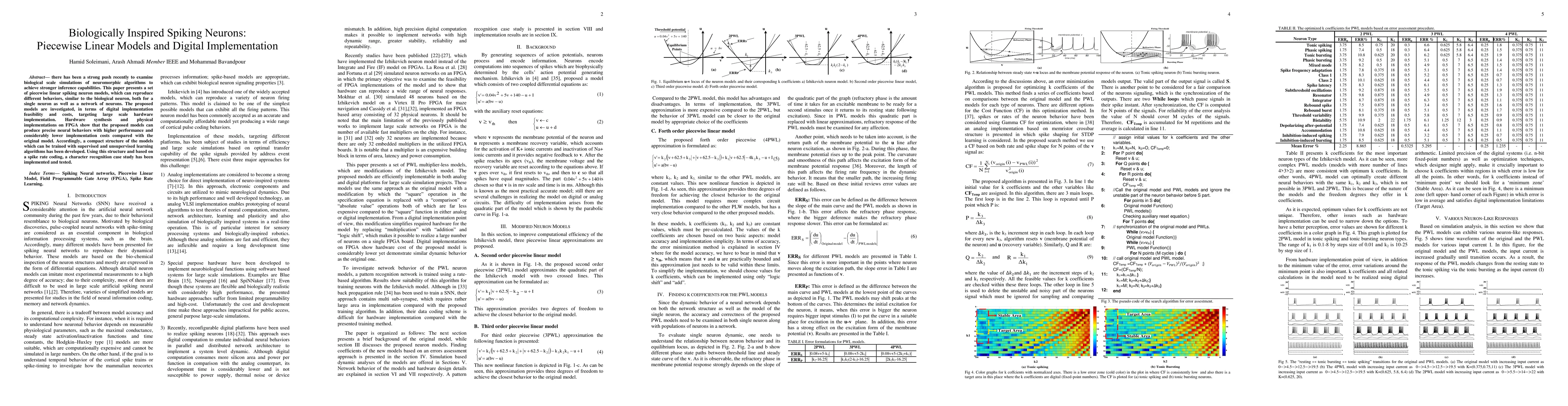 This paper introduces piecewise linear models for spiking neurons that mimic biological neurons, both individually and in networks. It demonstrates the feasibility and cost-effectiveness of these models in digital implementations, particularly on FPGAs, showing improved performance and lower costs compared to traditional models, and applies them in a character recognition case study.