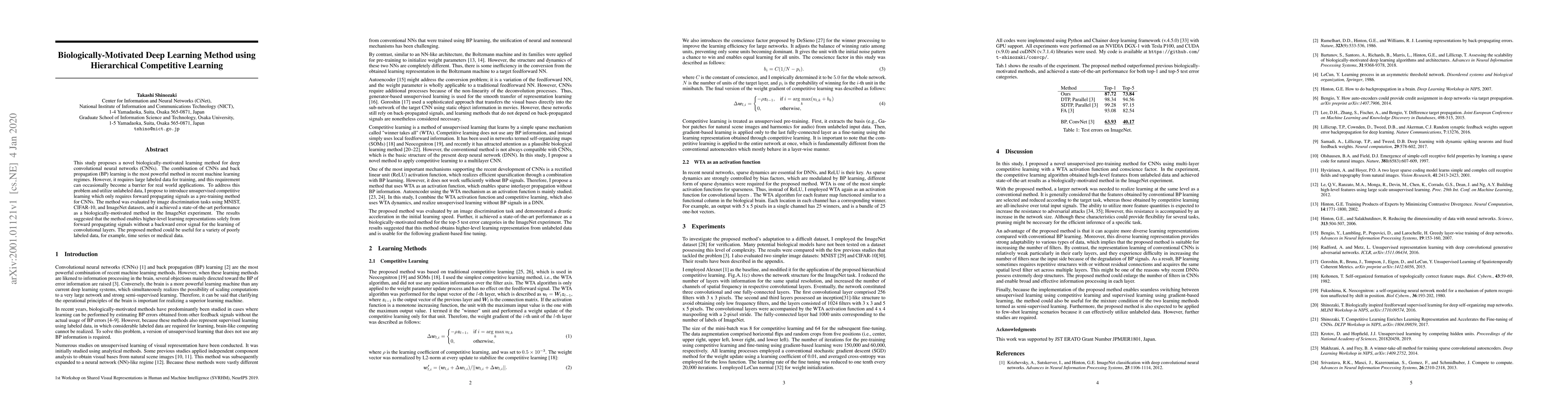 This study proposes a biologically-motivated deep learning method using hierarchical competitive learning to pre-train CNNs with unlabeled data, achieving state-of-the-art performance on ImageNet without requiring labeled data. The method enables effective learning representations from forward propagating signals alone.