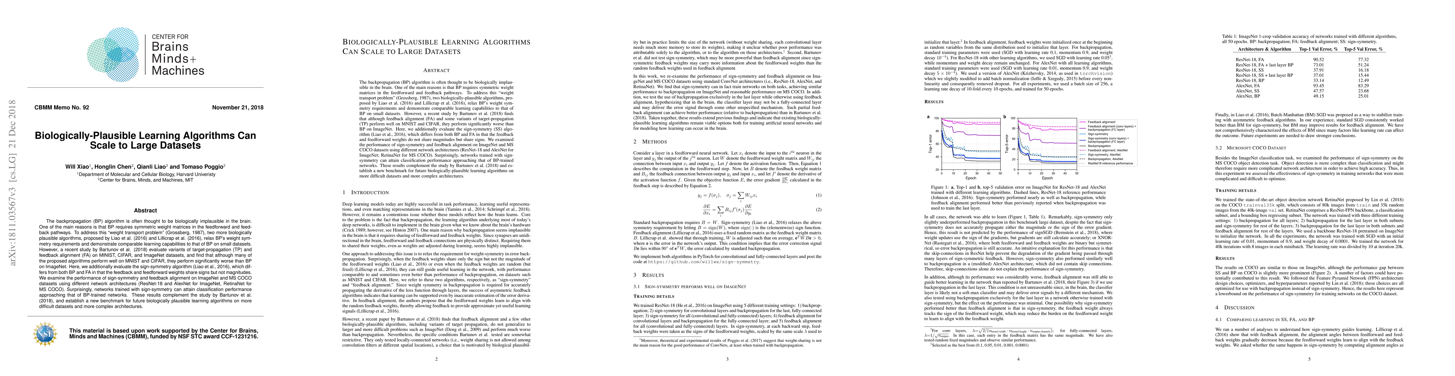 This paper evaluates biologically plausible learning algorithms, specifically the sign-symmetry algorithm, on large datasets like ImageNet and MS COCO, demonstrating that it can achieve performance comparable to backpropagation, thus setting a new benchmark for future research in this area.