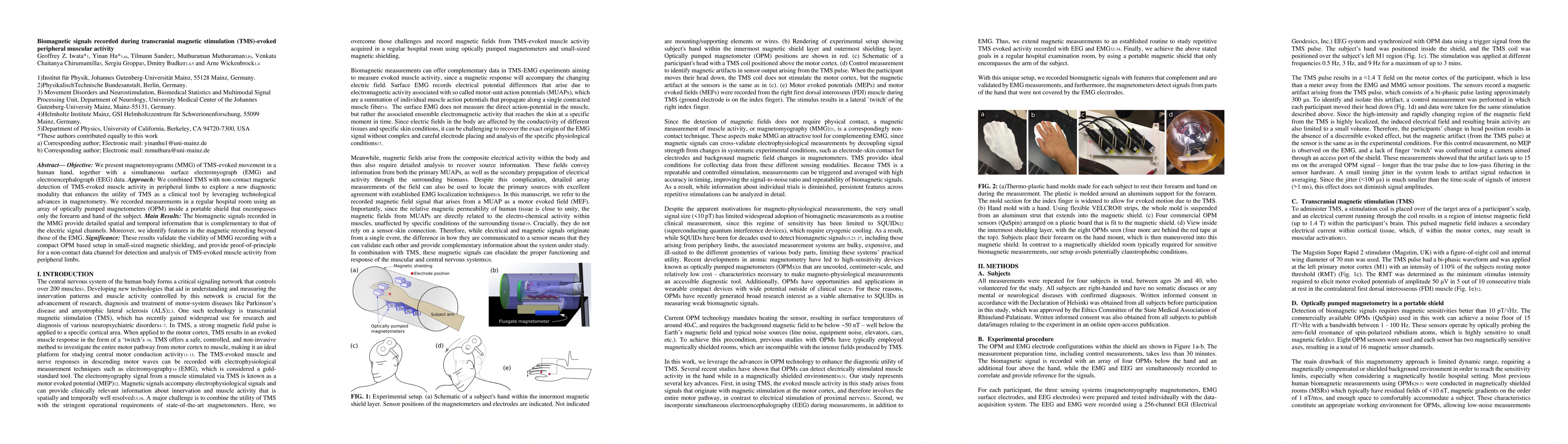 Objective: We present magnetomyograms (MMG) of TMS-evoked movement in a human hand, together with a simultaneous surface electromyograph (EMG) and electroencephalograph (EEG) data. Approach: We combined TMS with non-contact magnetic detection of TMS-evoked muscle activity in peripheral limbs to explore a new diagnostic modality that enhances the utility of TMS as a clinical tool by leveraging technological advances in magnetometry. We recorded measurements in a regular hospital room using an array of optically pumped magnetometers (OPM) inside a portable shield that encompasses only the forearm and hand of the subject. Main Results: The biomagnetic signals recorded in the MMG provide detailed spatial and temporal information that is complementary to that of the electric signal channels. Moreover, we identify features in the magnetic recording beyond those of the EMG. Significance: These results validate the viability of MMG recording with a compact OPM based setup in small-sized magnetic shielding, and provide proof-of-principle for a non-contact data channel for detection and analysis of TMS-evoked muscle activity from peripheral limbs.