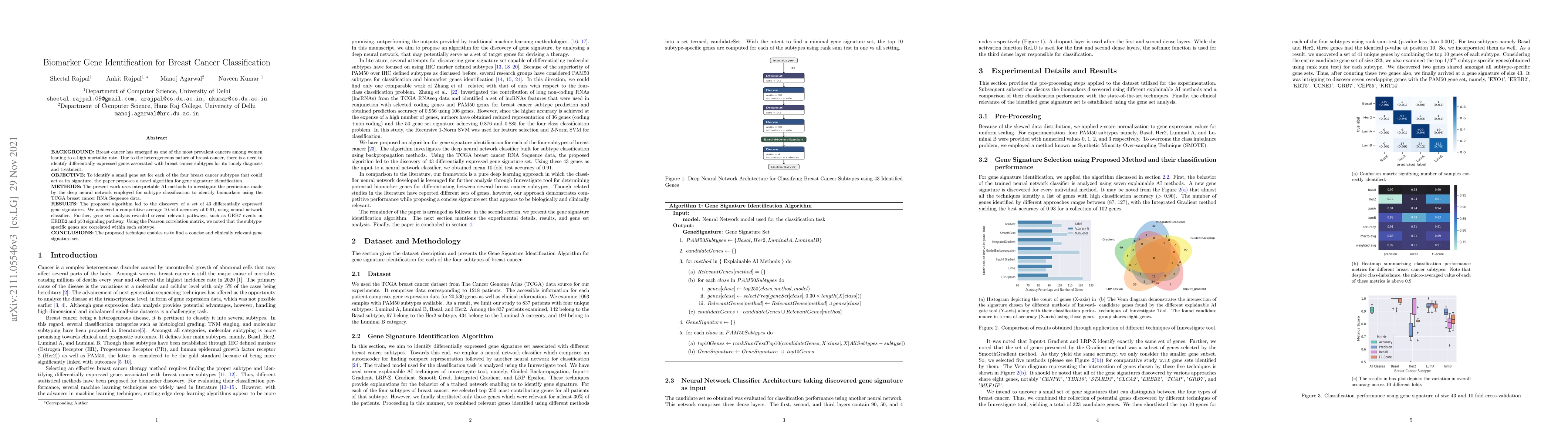 BACKGROUND: Breast cancer has emerged as one of the most prevalent cancers among women leading to a high mortality rate. Due to the heterogeneous nature of breast cancer, there is a need to identify differentially expressed genes associated with breast cancer subtypes for its timely diagnosis and treatment. OBJECTIVE: To identify a small gene set for each of the four breast cancer subtypes that could act as its signature, the paper proposes a novel algorithm for gene signature identification. METHODS: The present work uses interpretable AI methods to investigate the predictions made by the deep neural network employed for subtype classification to identify biomarkers using the TCGA breast cancer RNA Sequence data. RESULTS: The proposed algorithm led to the discovery of a set of 43 differentially expressed gene signatures. We achieved a competitive average 10-fold accuracy of 0.91, using neural network classifier. Further, gene set analysis revealed several relevant pathways, such as GRB7 events in ERBB2 and p53 signaling pathway. Using the Pearson correlation matrix, we noted that the subtype-specific genes are correlated within each subtype. CONCLUSIONS: The proposed technique enables us to find a concise and clinically relevant gene signature set.