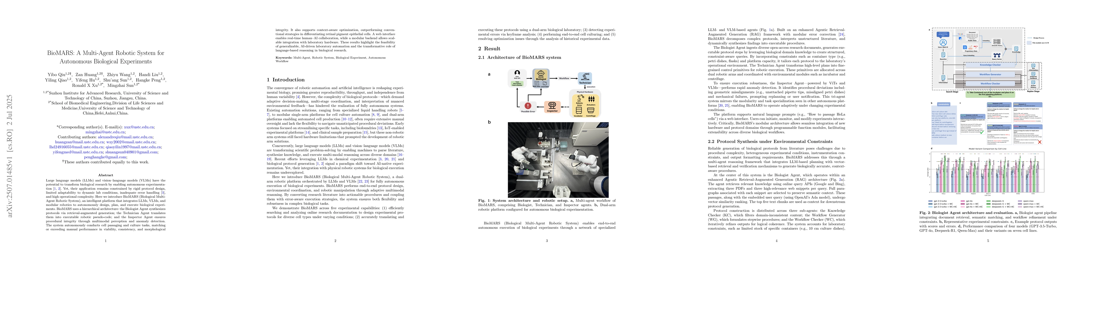 Large language models (LLMs) and vision-language models (VLMs) have the potential to transform biological research by enabling autonomous experimentation. Yet, their application remains constrained by rigid protocol design, limited adaptability to dynamic lab conditions, inadequate error handling, and high operational complexity. Here we introduce BioMARS (Biological Multi-Agent Robotic System), an intelligent platform that integrates LLMs, VLMs, and modular robotics to autonomously design, plan, and execute biological experiments. BioMARS uses a hierarchical architecture: the Biologist Agent synthesizes protocols via retrieval-augmented generation; the Technician Agent translates them into executable robotic pseudo-code; and the Inspector Agent ensures procedural integrity through multimodal perception and anomaly detection. The system autonomously conducts cell passaging and culture tasks, matching or exceeding manual performance in viability, consistency, and morphological integrity. It also supports context-aware optimization, outperforming conventional strategies in differentiating retinal pigment epithelial cells. A web interface enables real-time human-AI collaboration, while a modular backend allows scalable integration with laboratory hardware. These results highlight the feasibility of generalizable, AI-driven laboratory automation and the transformative role of language-based reasoning in biological research.