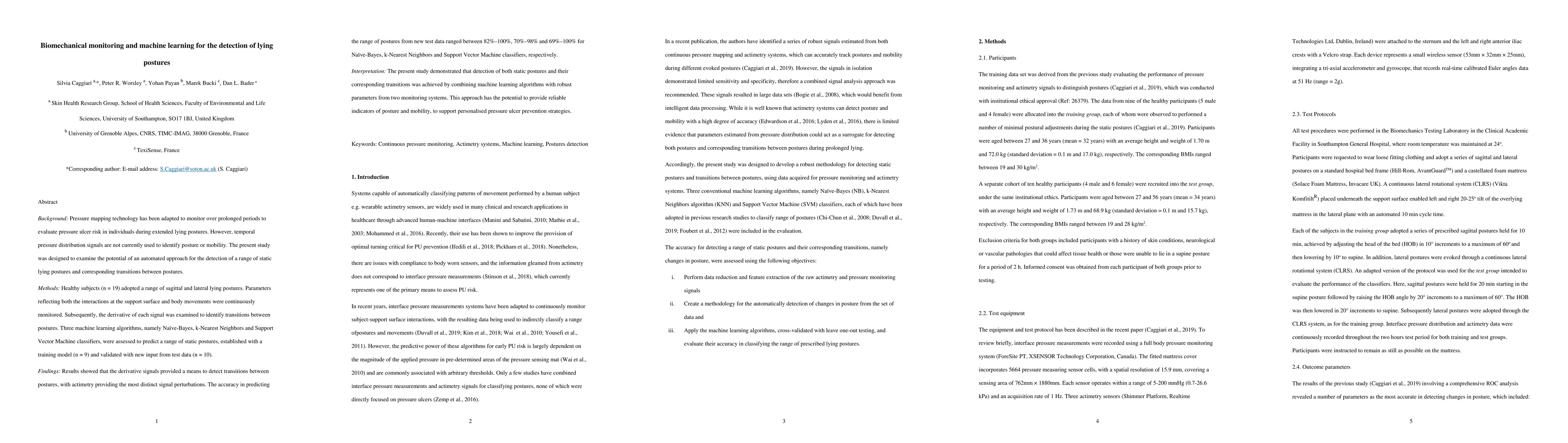 Background: Pressure mapping technology has been adapted to monitor over prolonged periods to evaluate pressure ulcer risk in individuals during extended lying postures. However, temporal pressure distribution signals are not currently used to identify posture or mobility. The present study was designed to examine the potential of an automated approach for the detection of a range of static lying postures and corresponding transitions between postures.Methods: Healthy subjects (n = 19) adopted a range of sagittal and lateral lying postures. Parameters reflecting both the interactions at the support surface and body movements were continuously monitored. Subsequently, the derivative of each signal was examined to identify transitions between postures. Three machine learning algorithms, namely Na{\"i}ve-Bayes, k-Nearest Neighbors and Support Vector Machine classifiers, were assessed to predict a range of static postures, established with a training model (n = 9) and validated with new input from test data (n = 10).Findings: Results showed that the derivative signals provided a means to detect transitions between postures, with actimetry providing the most distinct signal perturbations. The accuracy in predicting the range of postures from new test data ranged between 82%--100%, 70%--98% and 69%--100% for Na{\"i}ve-Bayes, k-Nearest Neighbors and Support Vector Machine classifiers, respectively.Interpretation: The present study demonstrated that detection of both static postures and their corresponding transitions was achieved by combining machine learning algorithms with robust parameters from two monitoring systems. This approach has the potential to provide reliable indicators of posture and mobility, to support personalised pressure ulcer prevention strategies.