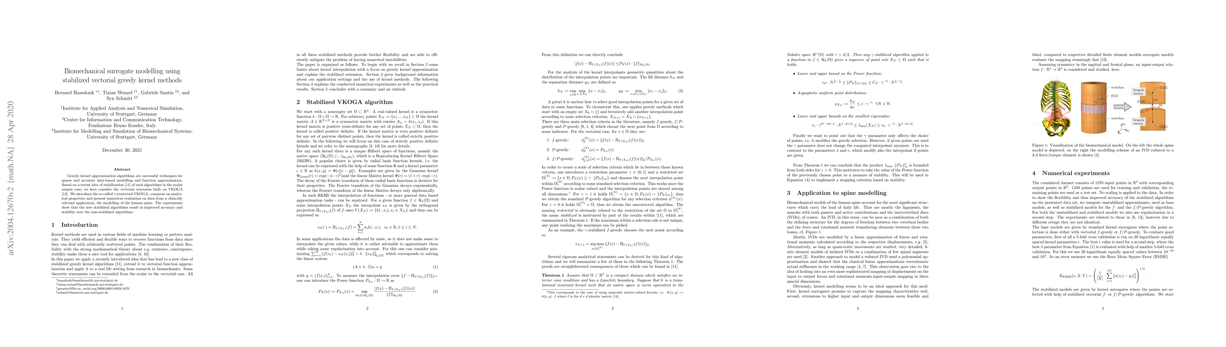 This paper introduces a stabilized vectorial greedy kernel method, $\gamma$-restricted VKOGA, for biomechanical surrogate modelling, specifically for the human spine. The new approach demonstrates improved accuracy and stability compared to non-stabilized versions, as shown through numerical evaluations.