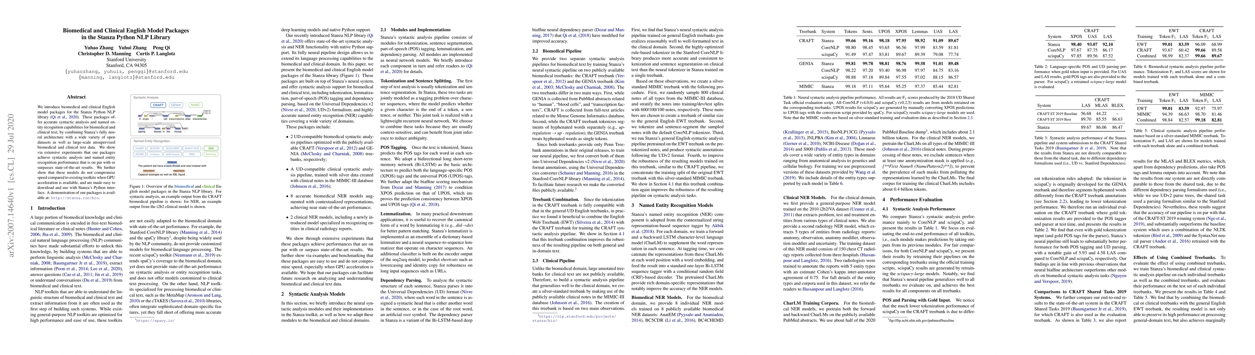 This paper introduces new biomedical and clinical English model packages for the Stanza Python NLP library, achieving top-tier syntactic analysis and named entity recognition performance through neural architecture and extensive datasets. The packages are fast, GPU-accelerated, and easily accessible via Stanza's Python interface.