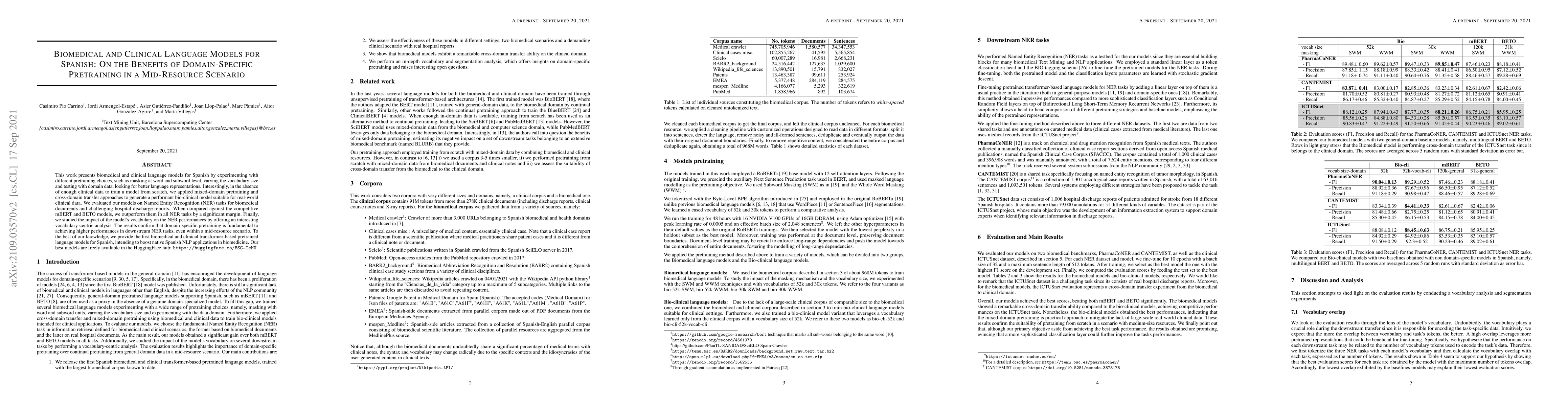 This paper introduces Spanish biomedical and clinical language models developed through domain-specific pretraining, achieving superior performance in Named Entity Recognition tasks compared to mBERT and BETO. The study highlights the effectiveness of mixed-domain pretraining in a mid-resource scenario, emphasizing the importance of vocabulary size and domain adaptation.